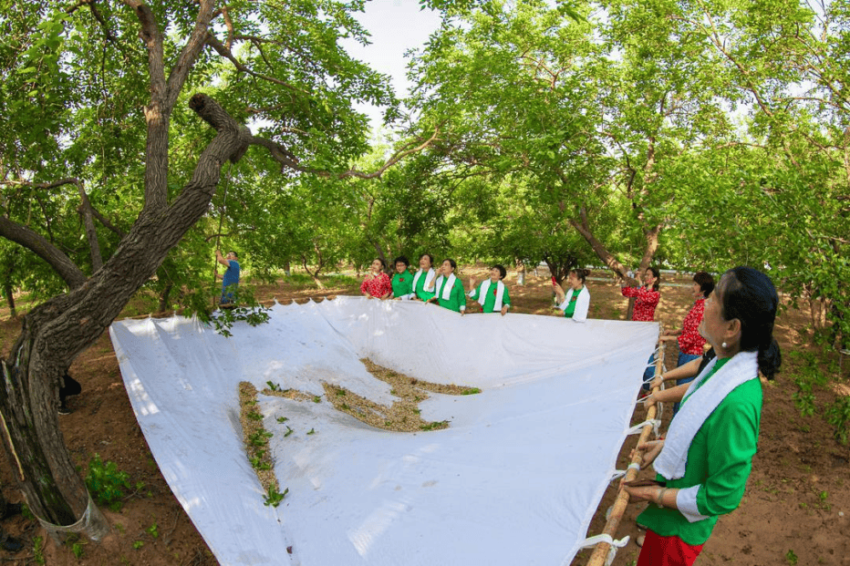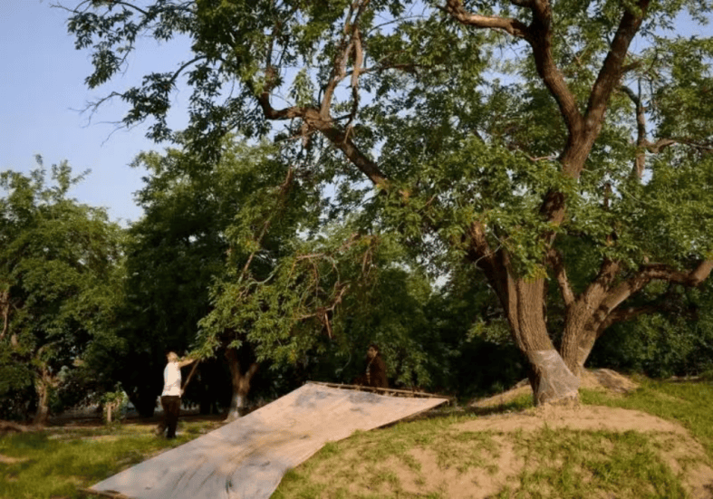 进入桑椹采摘季,在黄河故道森林公园古桑园里,总能遇见村民们用“抻包晃椹”的传统方法收获桑椹。