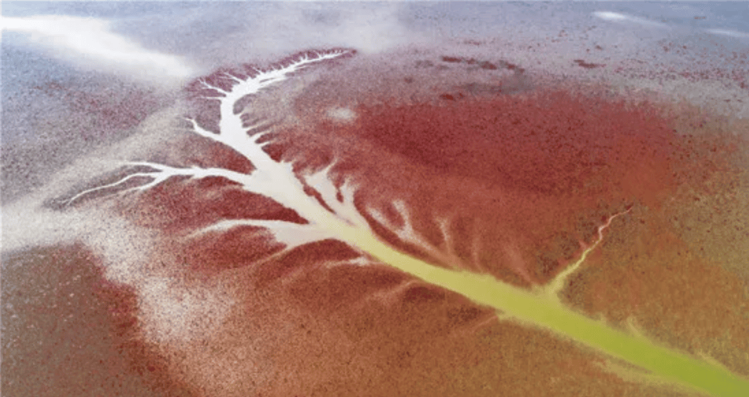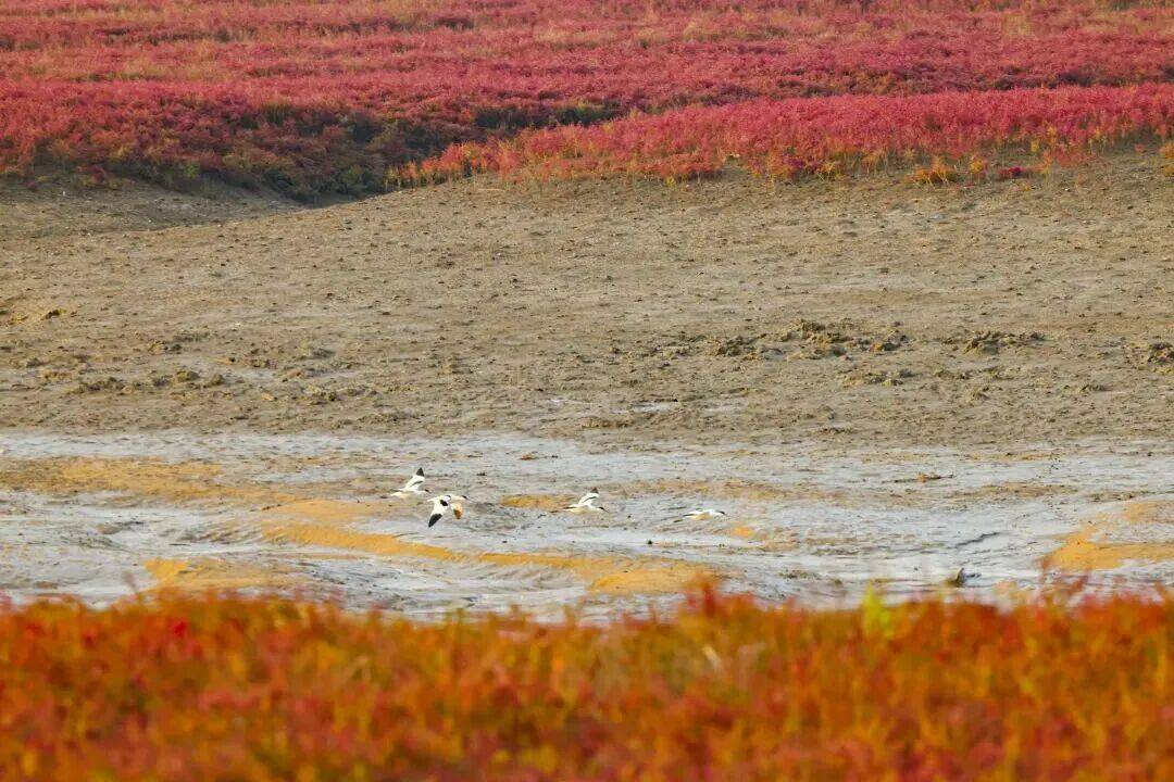 胶州湾退潮,红海滩夺人目光。沿着海滨观景步道前行,承载碱蓬草成长的泥土还带着海水的湿润。几只苍鹭正静立沉思,偶尔有反嘴鹬低飞掠过,细长的嘴在水面划出涟漪,构成生动的生态图景。
