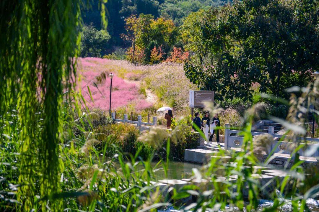 纭纭秋日,每一年粉黛花开的龙洞都值得期待。从地铁三号线龙洞站C口出来,向景区方向约走五百米,便是岸边成片摇曳着的粉黛乱子草。