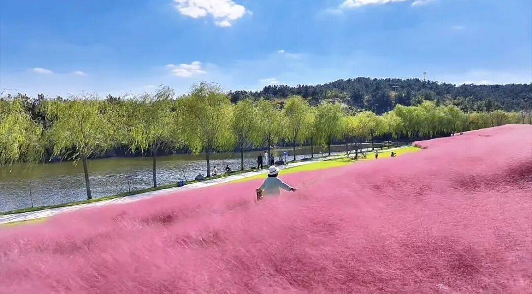 此时,临沂河湾公园的粉黛也迎来了一年中最佳观赏期。这片如梦似幻的粉色花海纤细的花穗裹着柔和的粉,像蓬松的粉色棉花糖。