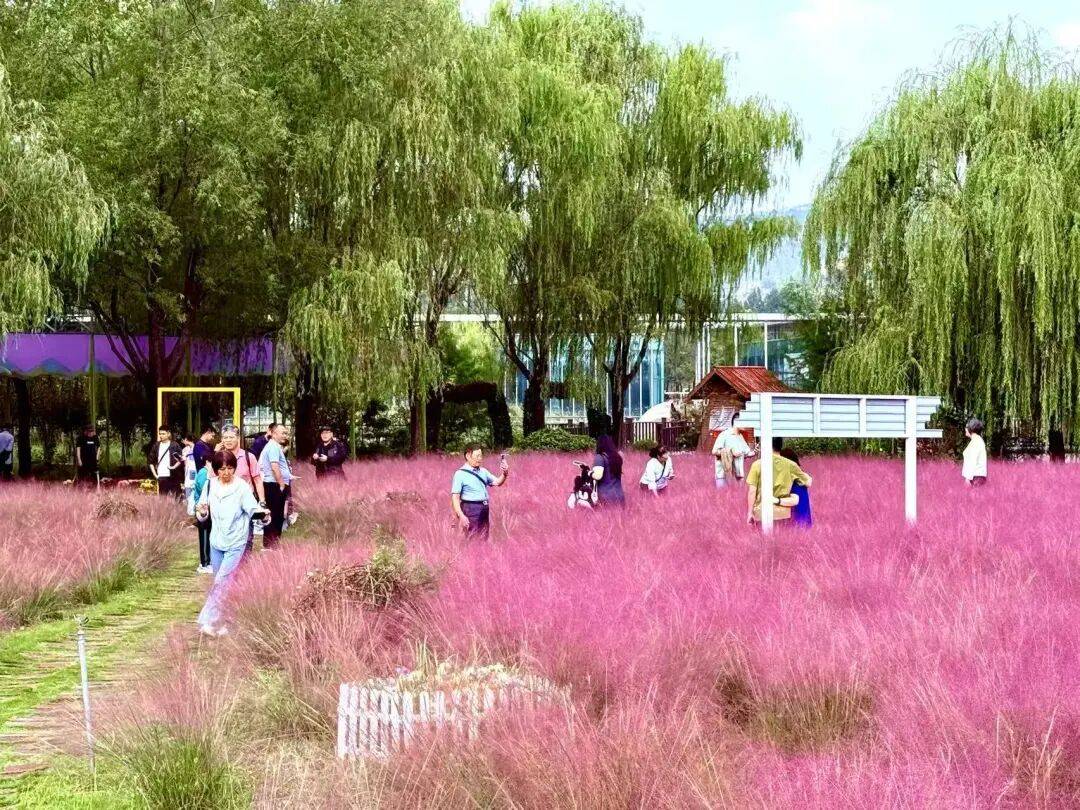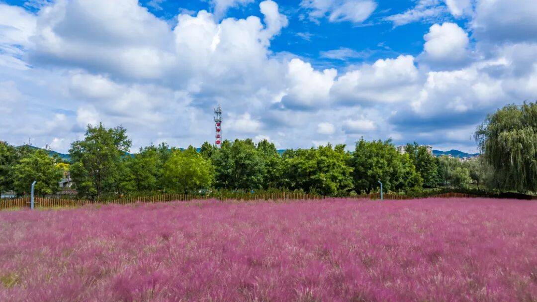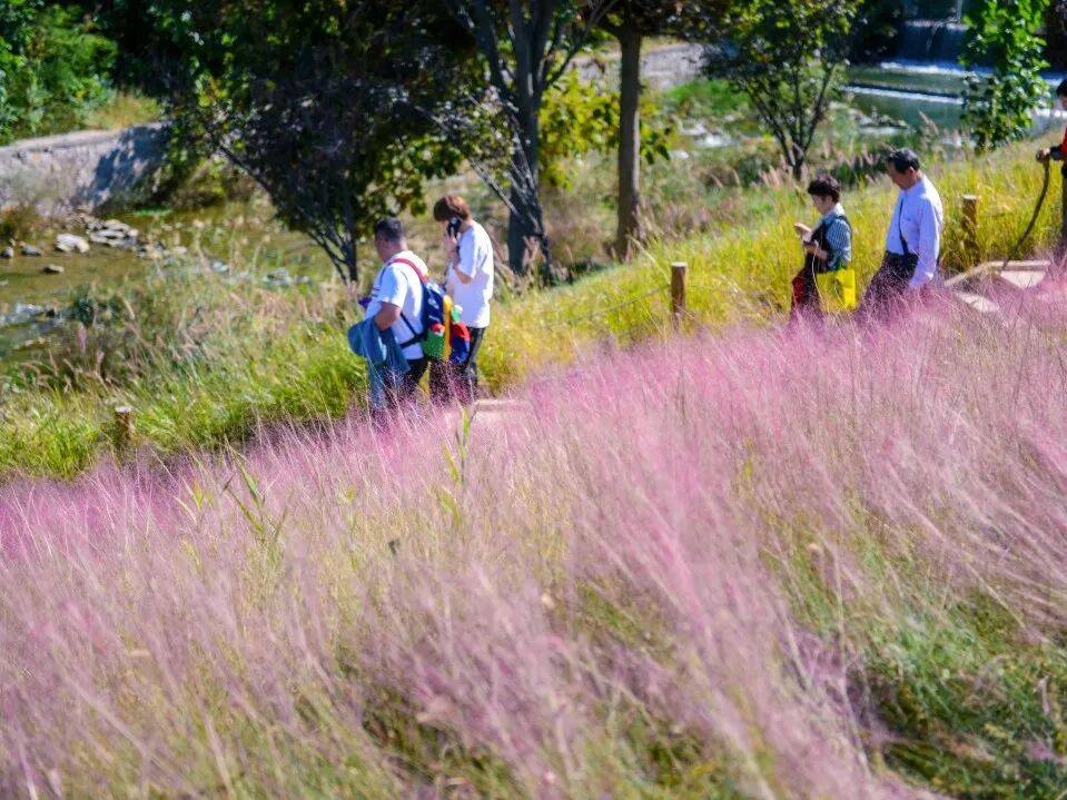 此时,羊亭河湿地公园的粉黛乱子草从花穗顶端开始晕染出淡淡的粉晕,为秋日勾勒出朦胧浪漫的轮廓。走进公园一期核心观赏区,连片的粉黛乱子草形成了一片粉色海洋。