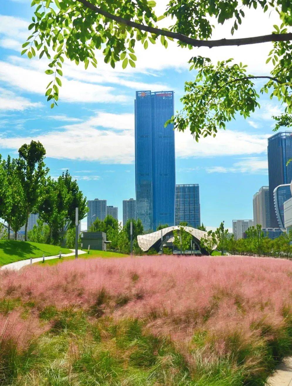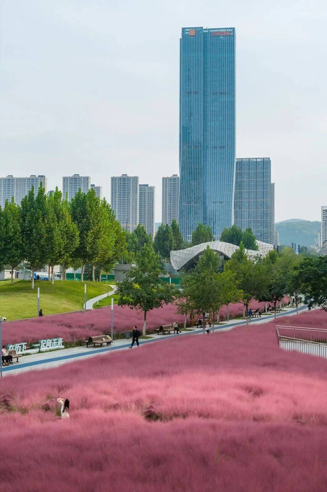泉城人才公园的粉黛较为狭长,像一条彩色的绸带将周边的高楼拥抱,如烟似雾,朦朦胧胧让人心动,成为都市生活的温柔慰藉。