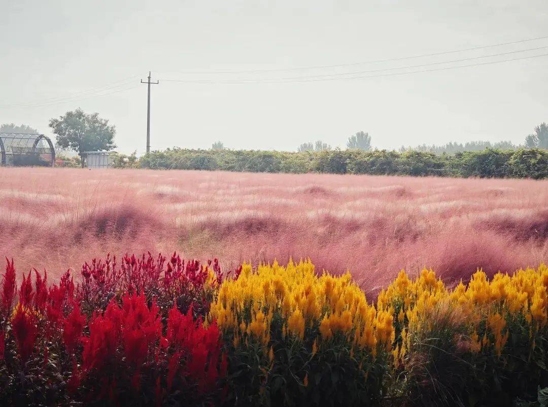 除了粉黛,这里还有大片凤尾花田,明艳的红、浓郁的黄、淡雅的粉碰撞在一起,好似大自然打翻的调色板。