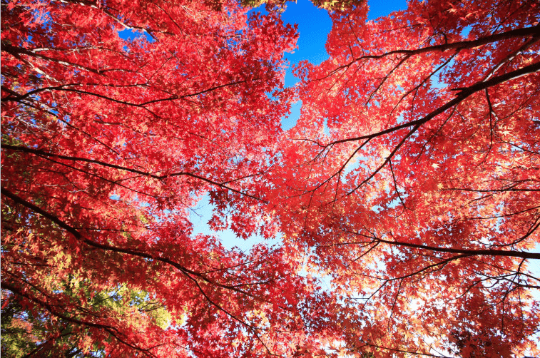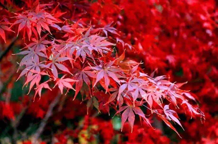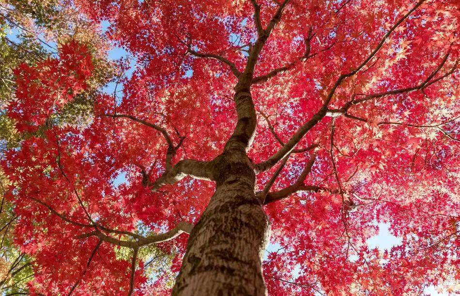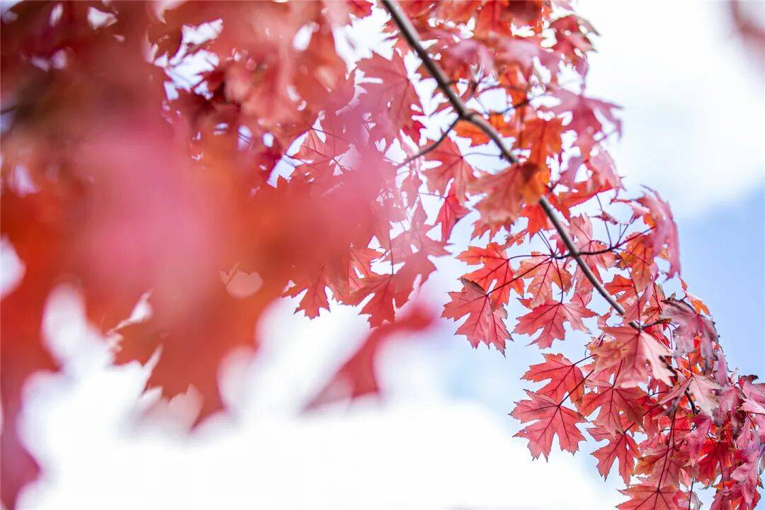 远观时,随风而动的枫树就像火焰在滚动;近看时,密集的枫叶呈现极具层次感的红。一阵秋风袭来,树叶从树梢飘落,宛若飞舞旋转的蝴蝶,将秋景渲染到了极致。
