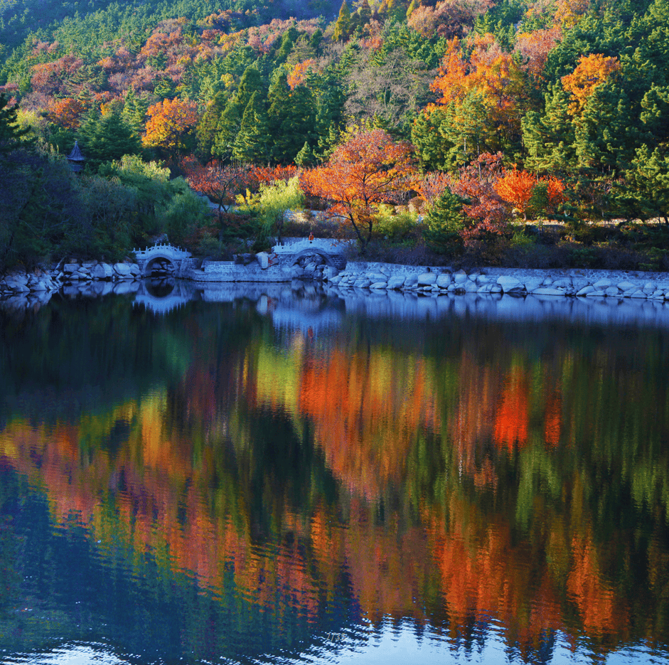 漫山枫叶犹如炽热的火焰,洋溢着无尽的热情与奔放。山中楼阁,亭台流水,和着遍地的红叶,生发出万千气象。更有那火红与橙黄的叶片相互交织、彼此映衬,共同编织出一幅色彩斑斓、绚丽夺目的秋日图。