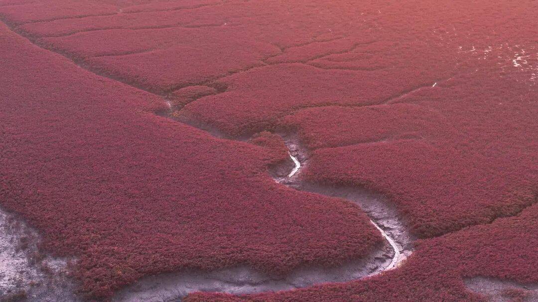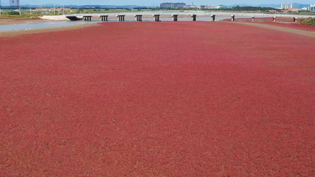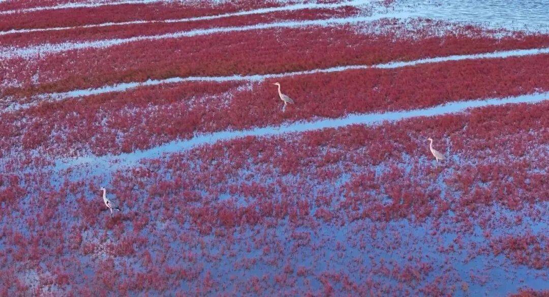 微风拂过连片的翅碱蓬,化作红色“草浪”轻轻起伏,与澄澈蓝天、粼粼海水相映成趣,勾勒出层次鲜明、动静相宜的湿地图景,成为威海的秋日限定美景。