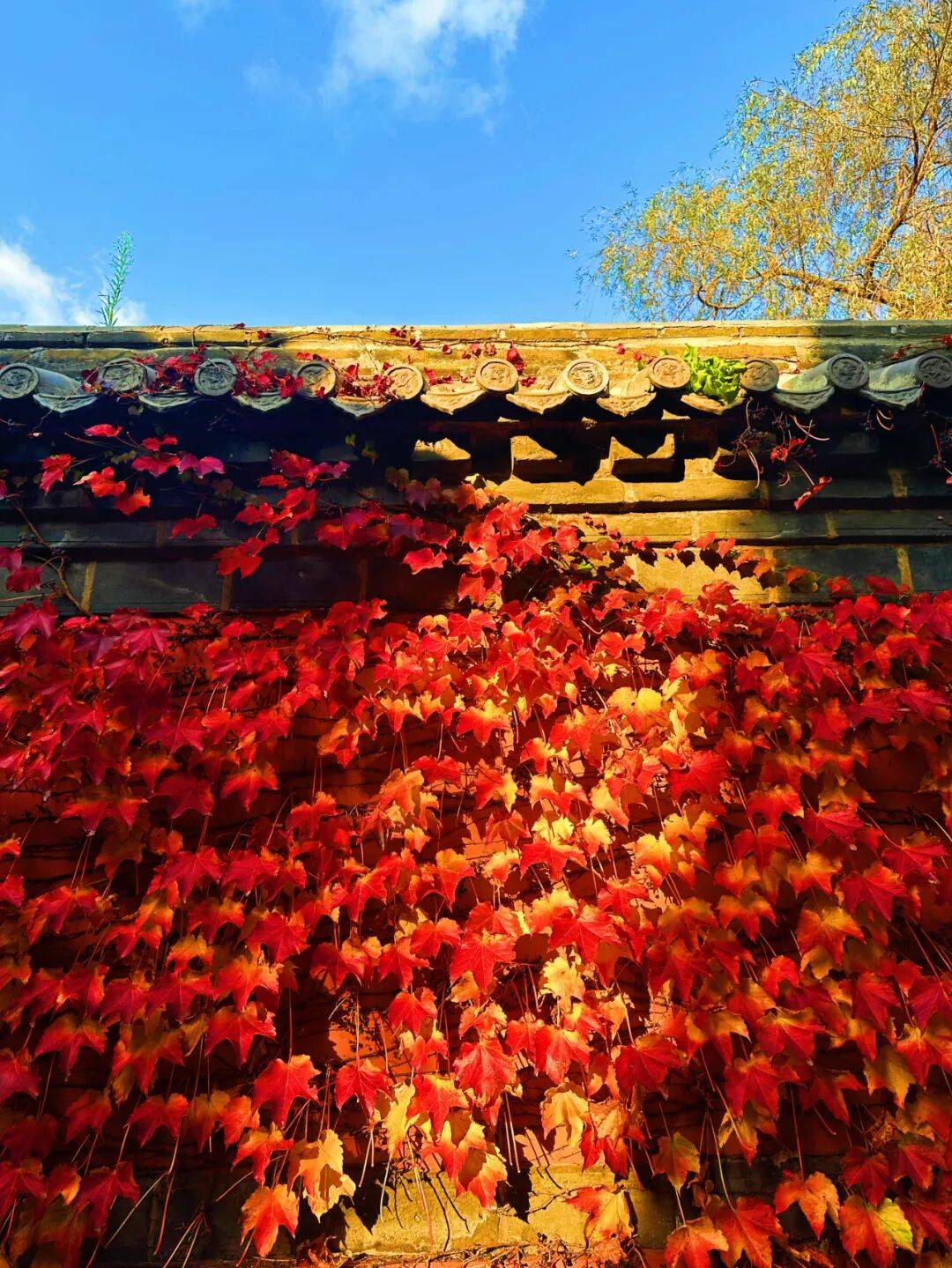 当秋风悄然拂过赤山景区,几分凉韵开始弥漫在山间,树叶逐渐变换出多样的色彩,宛如被大自然的魔杖点染,呈现出别样的风情。千叶万树,沿山底直攀山巅,刹那间,整个山林雀跃起来。红色的爬山虎,绕上印着龙图腾的瓦片。大风吹来,枫叶就簌簌落满一地。