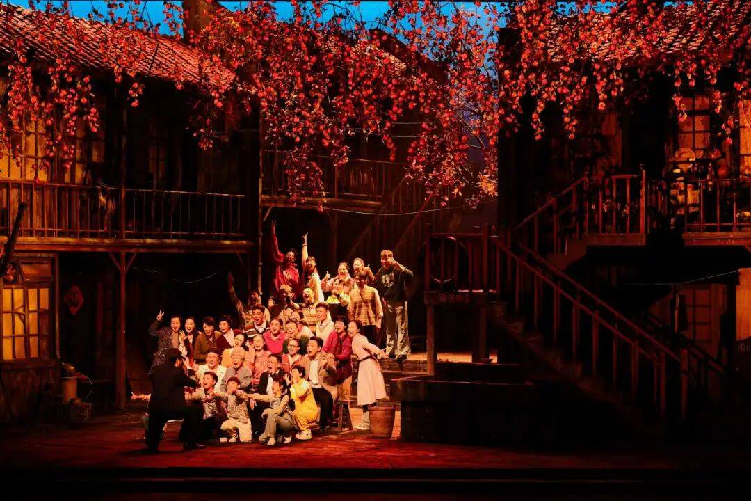 他带领团队深入里院调研,记录墙面裂纹、台阶磨损、窗棂高度、屋檐弧度等细节,再将这些细节还原于舞台——年代感十足的天线、电线瓷壶,厕所与水房墙面的水渍和苔藓,让舞台上的“向阳院”满是生活质感;360度旋转的立体转台作为叙事核心,院内院外的切换、四季更迭的过渡、相聚离别的场景,都在转台转动间自然衔接。