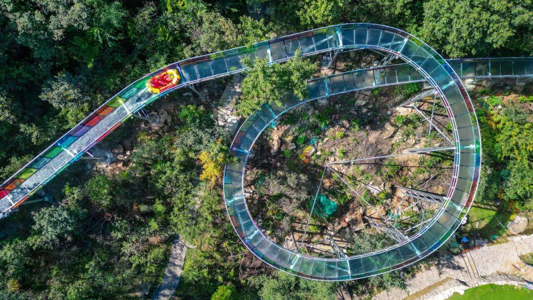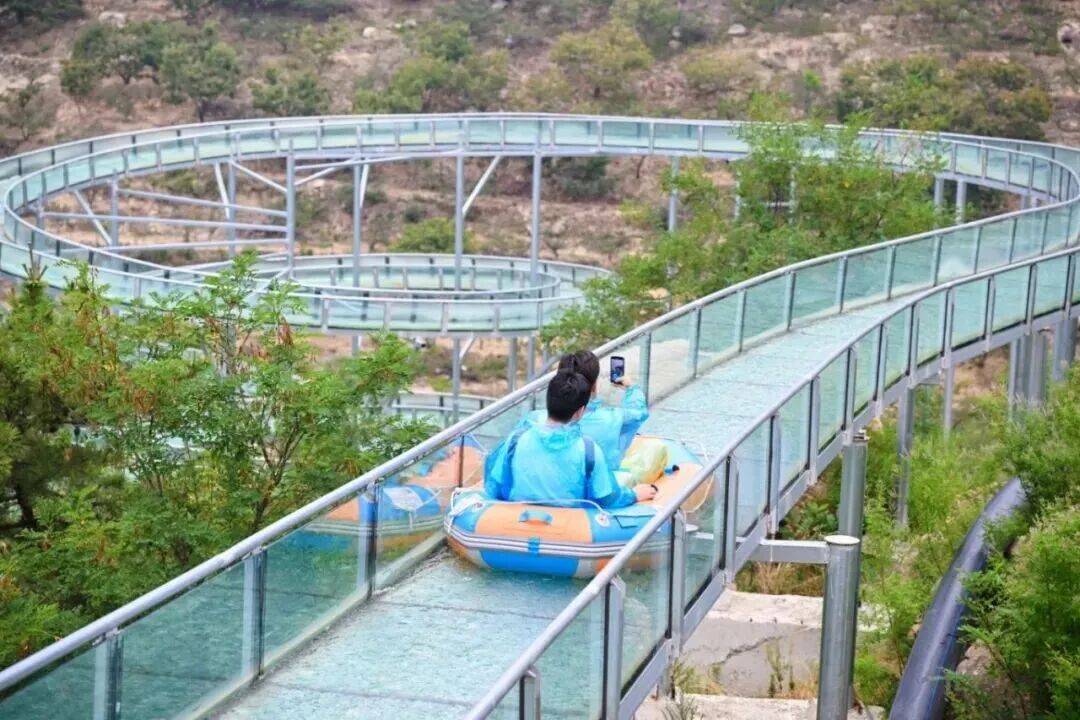 近2km的玻璃水道藏在树林深处,阳光被切成碎金撒在水面。水流载着尖叫掠过丛林,每一次转弯都撞进满目苍翠,风在耳边唱和,绿意裹着清爽扑面而来。