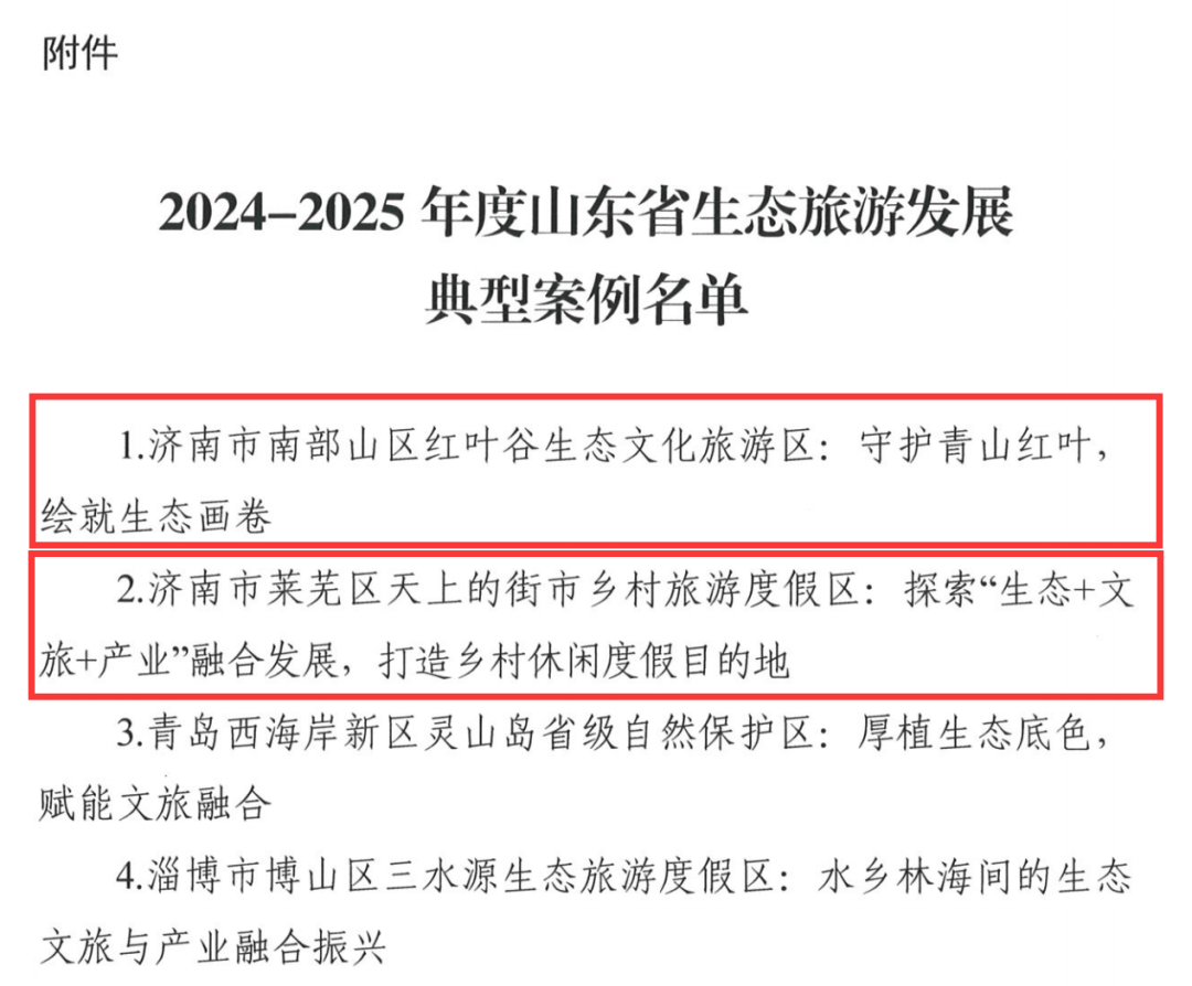 近日,由山东省文化和旅游厅、山东省生态环境厅共同主办的“生态山东 绿色休闲”2025山东生态旅游推进活动在济南市莱芜区举办。在活动现场,山东省文化和旅游厅公布了2024-2025年度山东省生态旅游发展典型案例名单。其中,济南市莱芜区天上的街市乡村旅游度假区和济南市南部山区红叶谷生态文化旅游区入选山东省生态旅游发展典型案例。