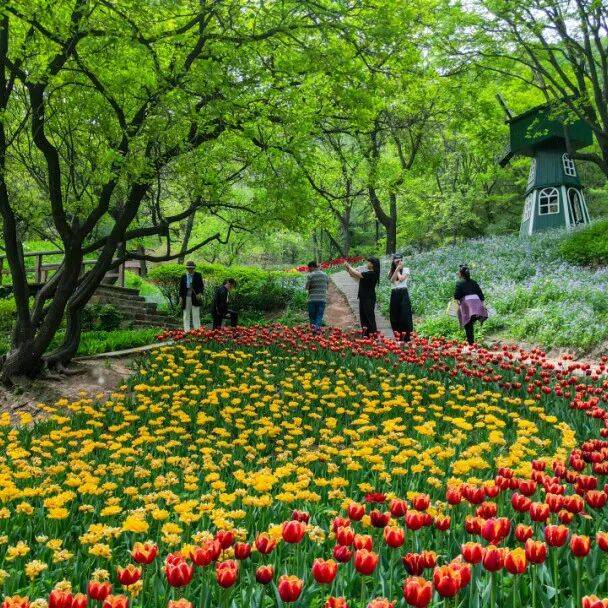 4-5月欧洲风情谷百万郁金香盛放,二月兰铺就紫色梦幻地毯,蝶舞蜂飞间满是欧式浪漫。