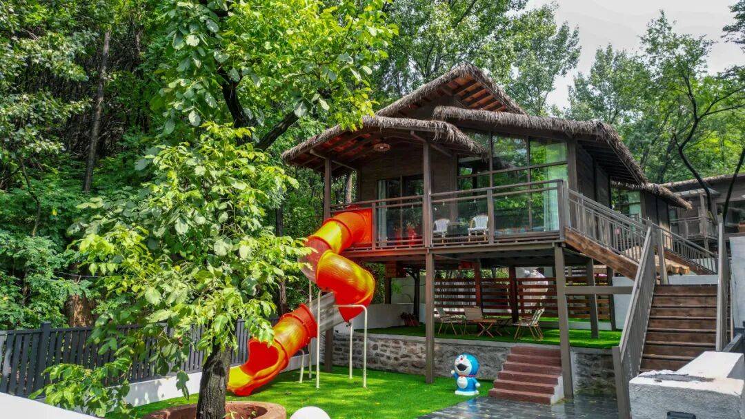 香巴拉民宿隐匿林间,一幢幢树屋错落有致,宛如自然间遗落的珍珠,镶嵌于翠绿与火红交织的画卷之中。