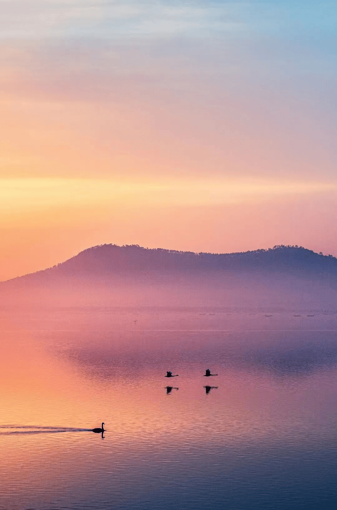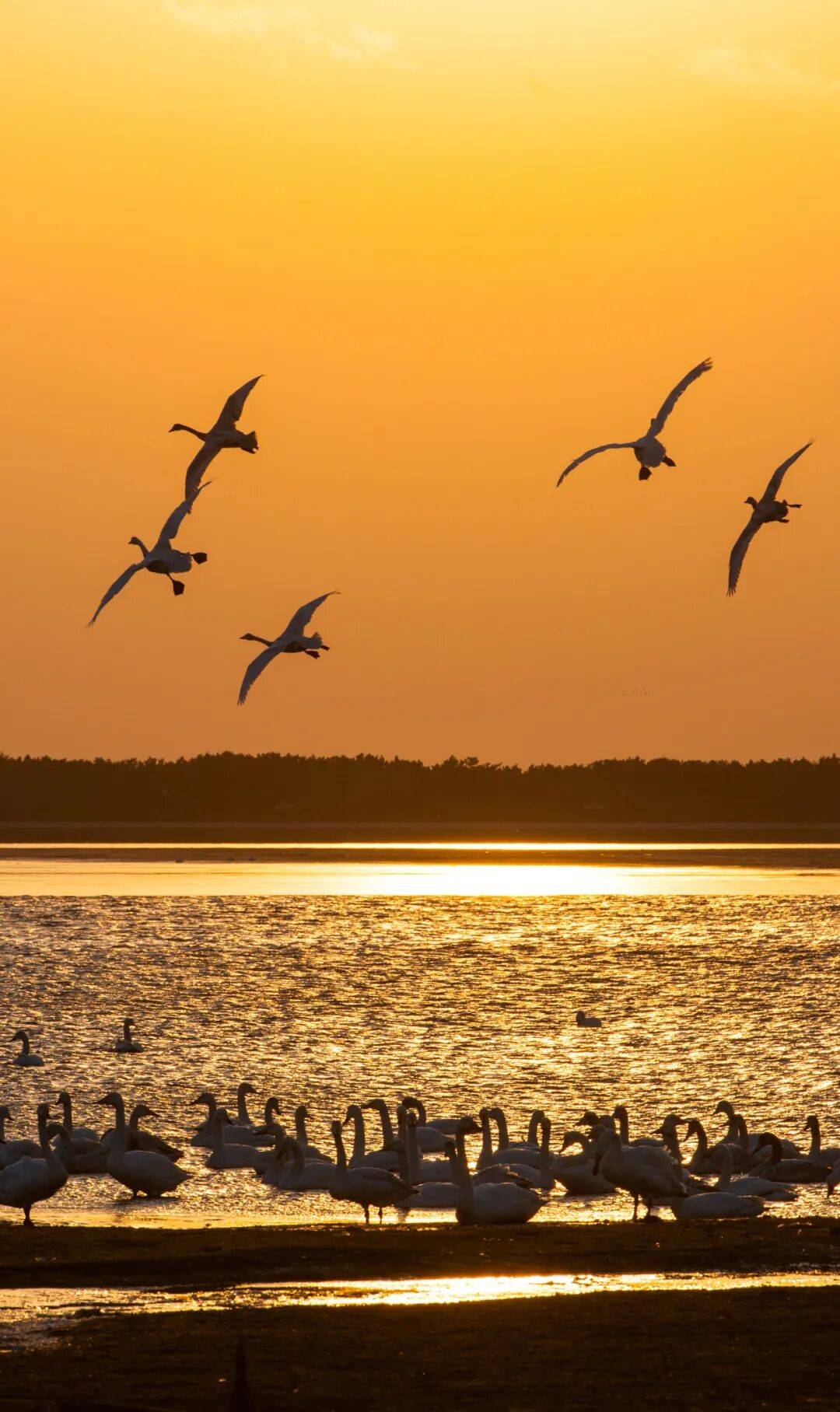 保护区内,天鹅们或悠然游弋,或引颈高歌,或展翅练习,每一个动作都充满优雅的韵律感。日落时,湖面染上金光,天鹅点缀其中,如同一幅水墨画。
