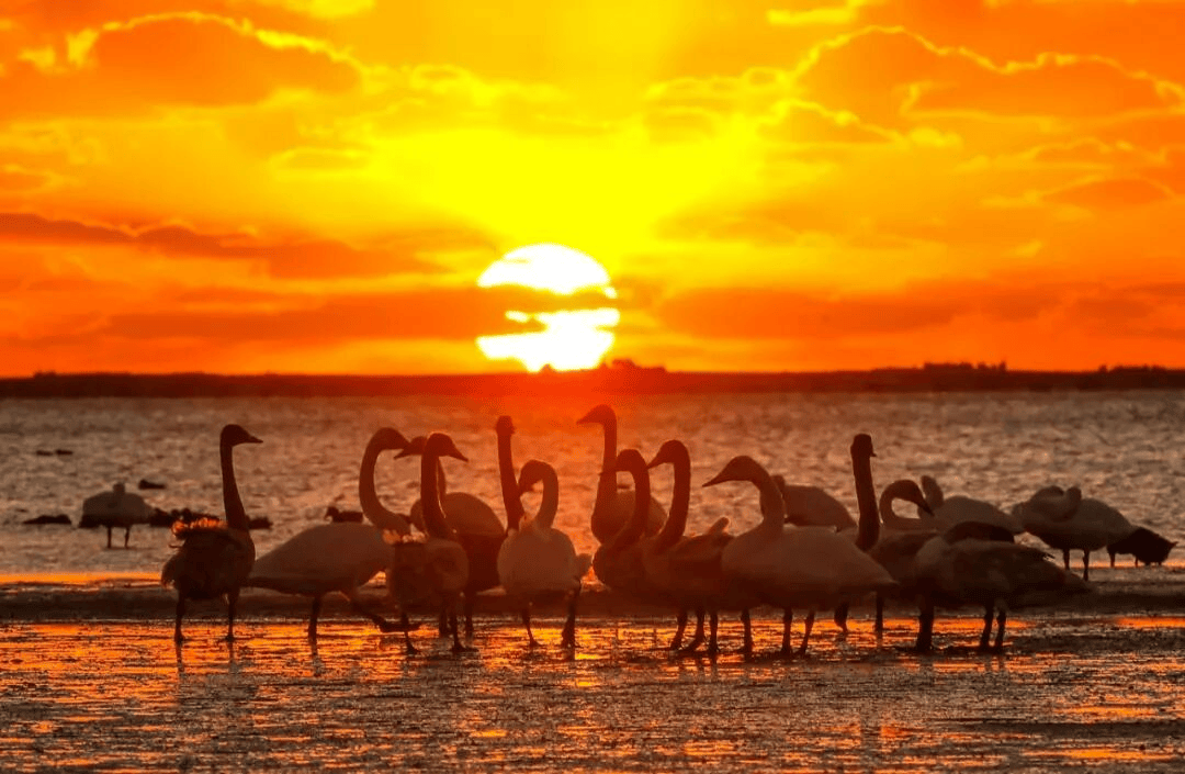 这里不仅离天鹅更近,更是看日出的好地方,东方既白,金色的阳光穿透晨雾,成群的天鹅在暖色调的湖面上振翅起飞,翅膀拍打水面的声音与清脆的鸣叫声交织成冬日最动人的交响乐。