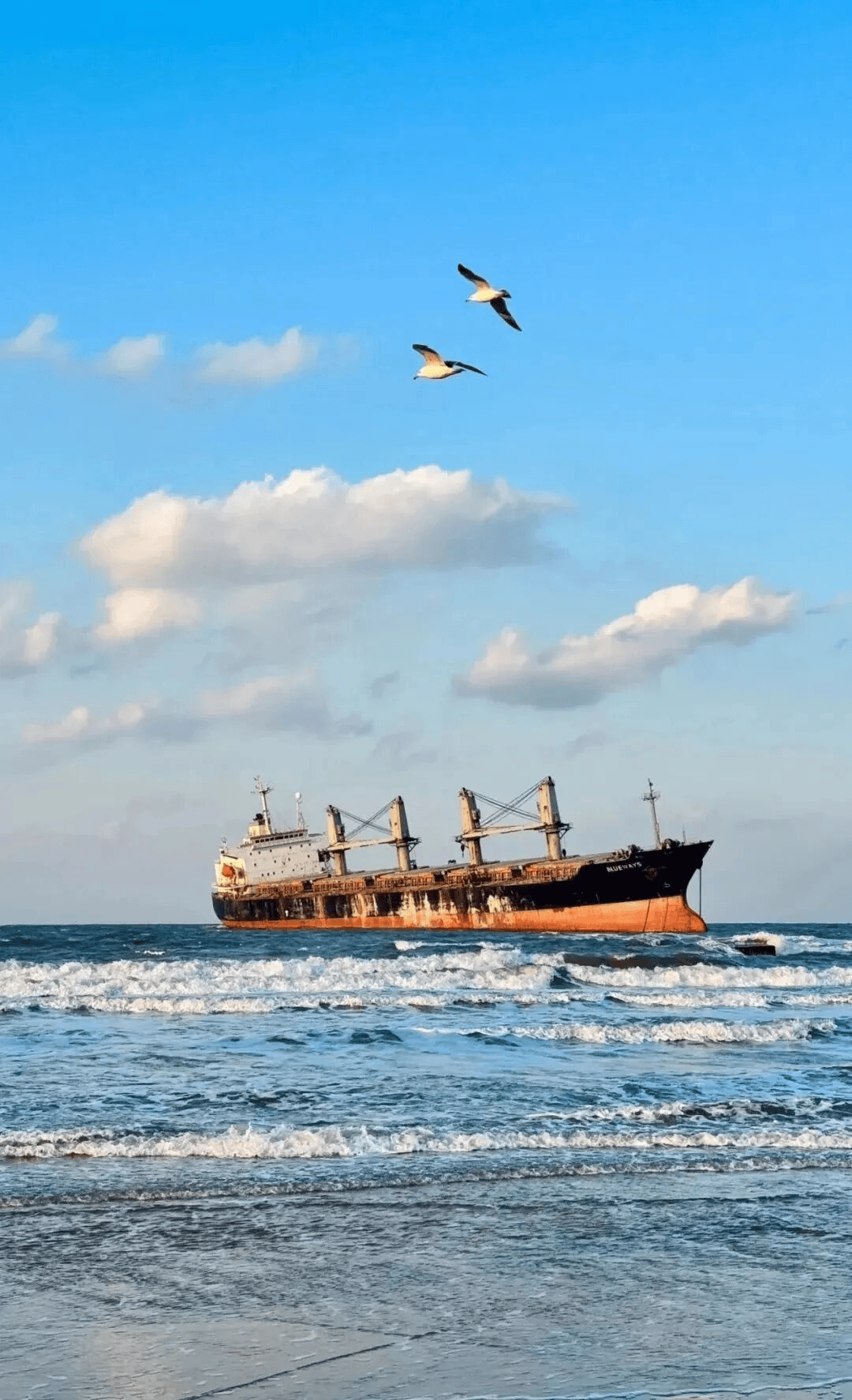 这艘身长百米的沉船,船舷爬满斑驳的红褐色铁锈,船身斜倚在碧浪里,在海鸥的环绕下更显得孤寂与浪漫。