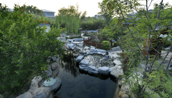 观唐温泉的温水乡内小桥流水,古意盎然,亭台楼阁,一步一景,漫步其中,仿佛穿越千年。