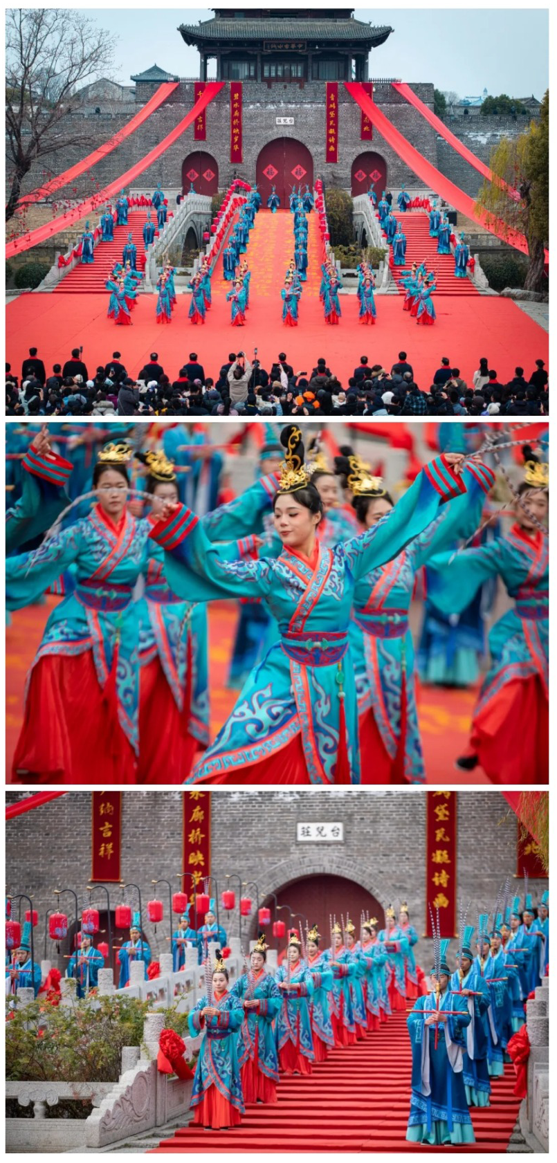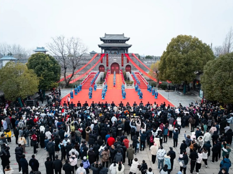 上午九时,旭日初升,台儿庄古城东门广场已是人潮涌动、鼓乐齐鸣。活动在古韵悠扬的《礼韵台城》表演中拉开序幕。伴随庄严号角,身着传统服饰的仪仗队伍肃立两侧,主礼嘉宾步履从容,行至巍峨的“福门”之前。随着震天的钟鼓声与全场游客激昂的倒计时,“福门”在万众瞩目下缓缓开启。大门开处,象征着吉祥、富足与希望的“福气”奔涌而出,寓意着新年国泰民安、繁荣昌盛。