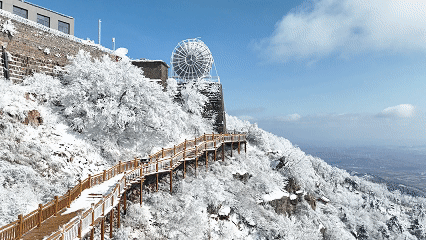 玉皇顶的雾凇长廊,被称为最梦幻的冬季步道。阳光透过时,整个森林都在发光。