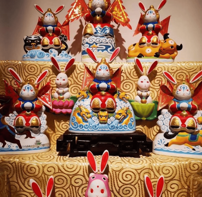 济南兔子王,则是济南泥塑的代表。传统兔子王身披朱红袍甲,后插双旗,红、蓝、金三色交织,喜庆夺目,透着老济南的年味。