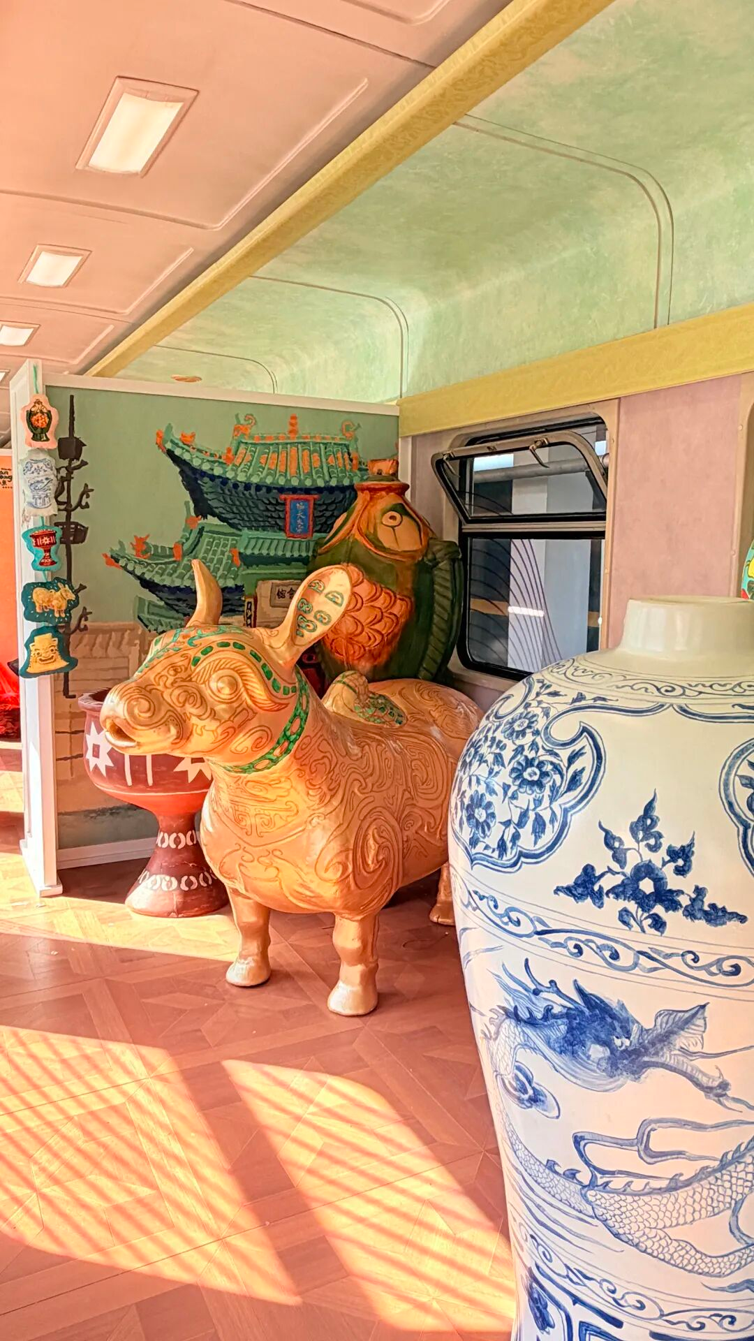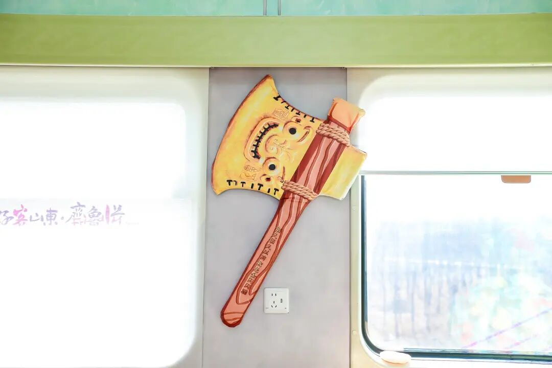在本列文物研学主题旅游列车上,你可以在不同角落发现它的身影。或许是以手绘形式出现在车厢端墙,或许化身为超大拼图,等待着每一位乘客去发现。