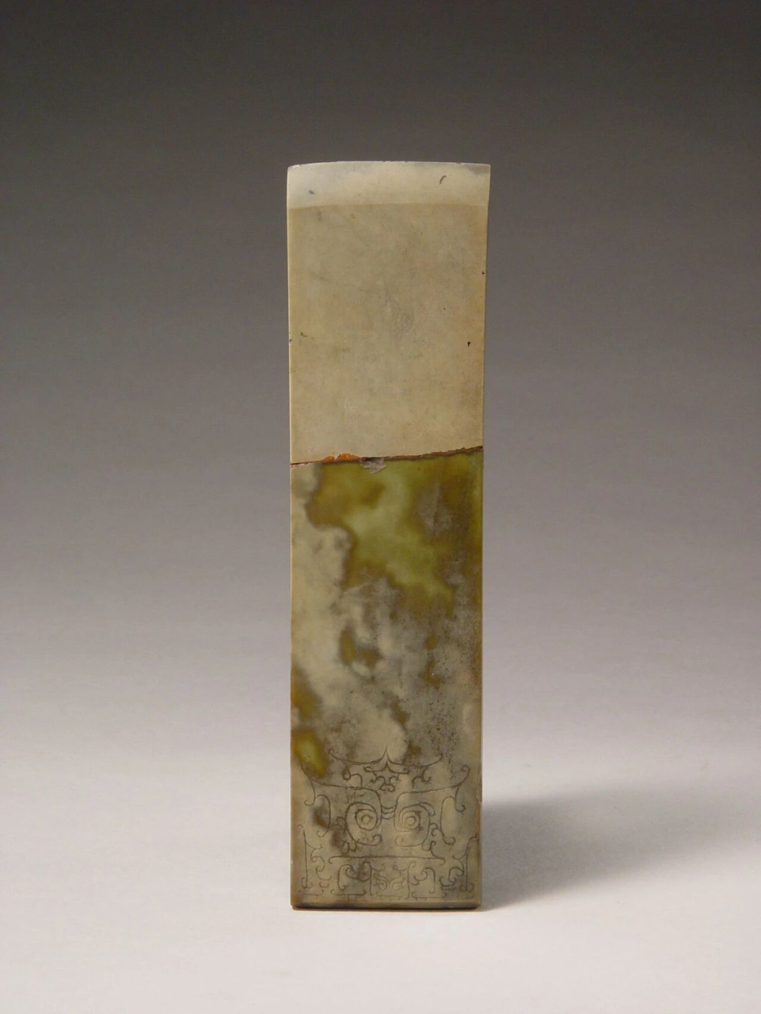 山东博物馆藏的这件兽面纹玉锛,因曾断为两截被埋藏在不同的地层,上半部分已被沁为白色,下半部分仍能看见墨绿色的玉质本身。