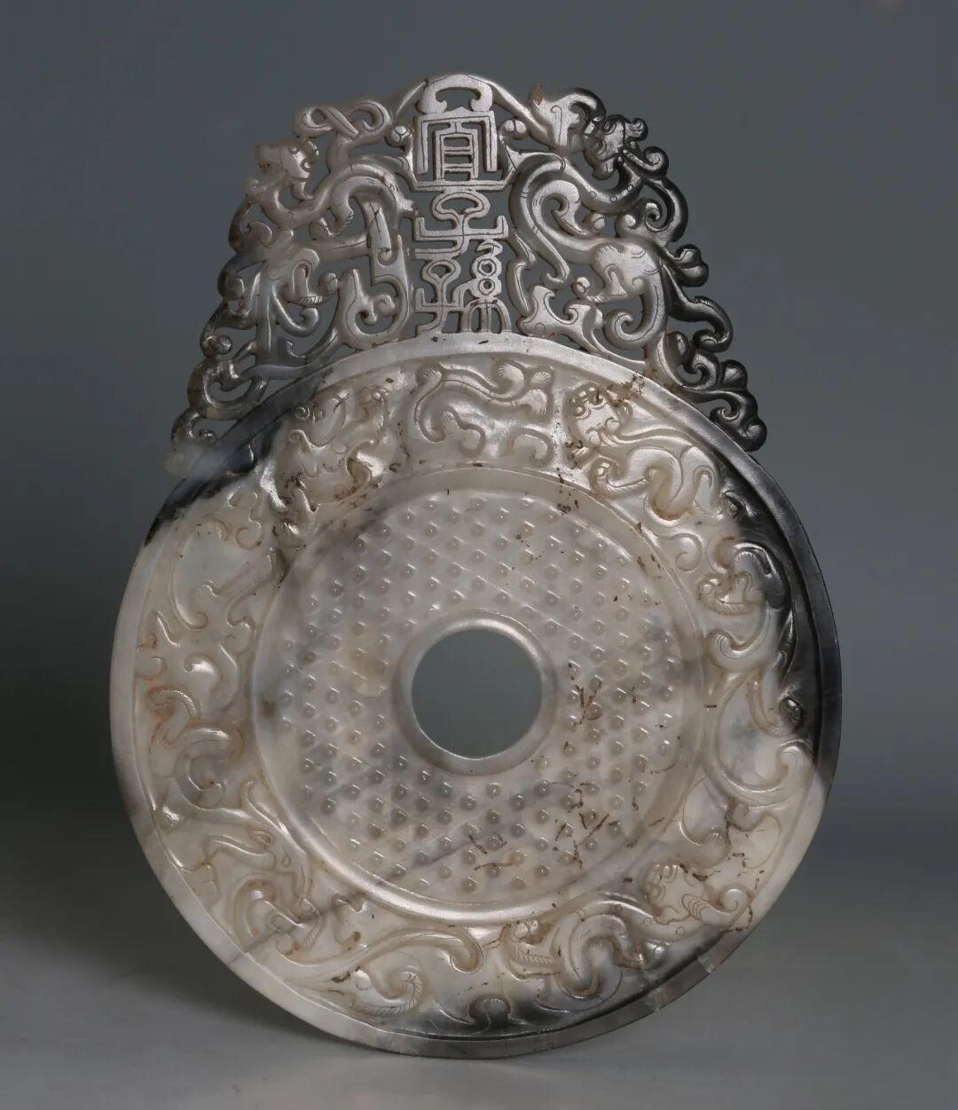 这枚圆形出廓玉璧上方镂雕双龙纽,纽中央透雕篆书“宜子孙”三字,乃“子子孙孙宜室宜家”的吉祥用语。