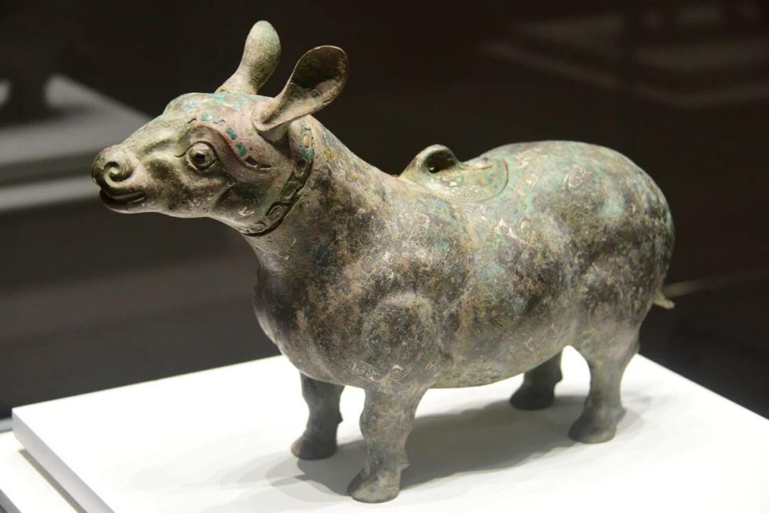 这个牺尊仿牛形,昂首竖耳,四肢为偶蹄,憨厚中透着灵动。通体装饰则以粗细相间的金丝与银丝,嵌饰出流畅的几何云纹,生动展现了齐国手工业的技术水平。