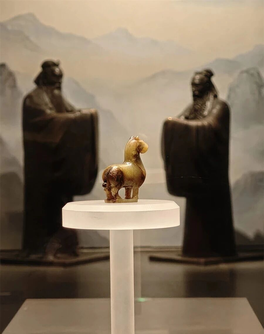 现存于孔子博物馆的战国圆雕黄玉马质地温润、面带微笑,使用“俏色”工艺呈现出马匹毛发的自然质感。