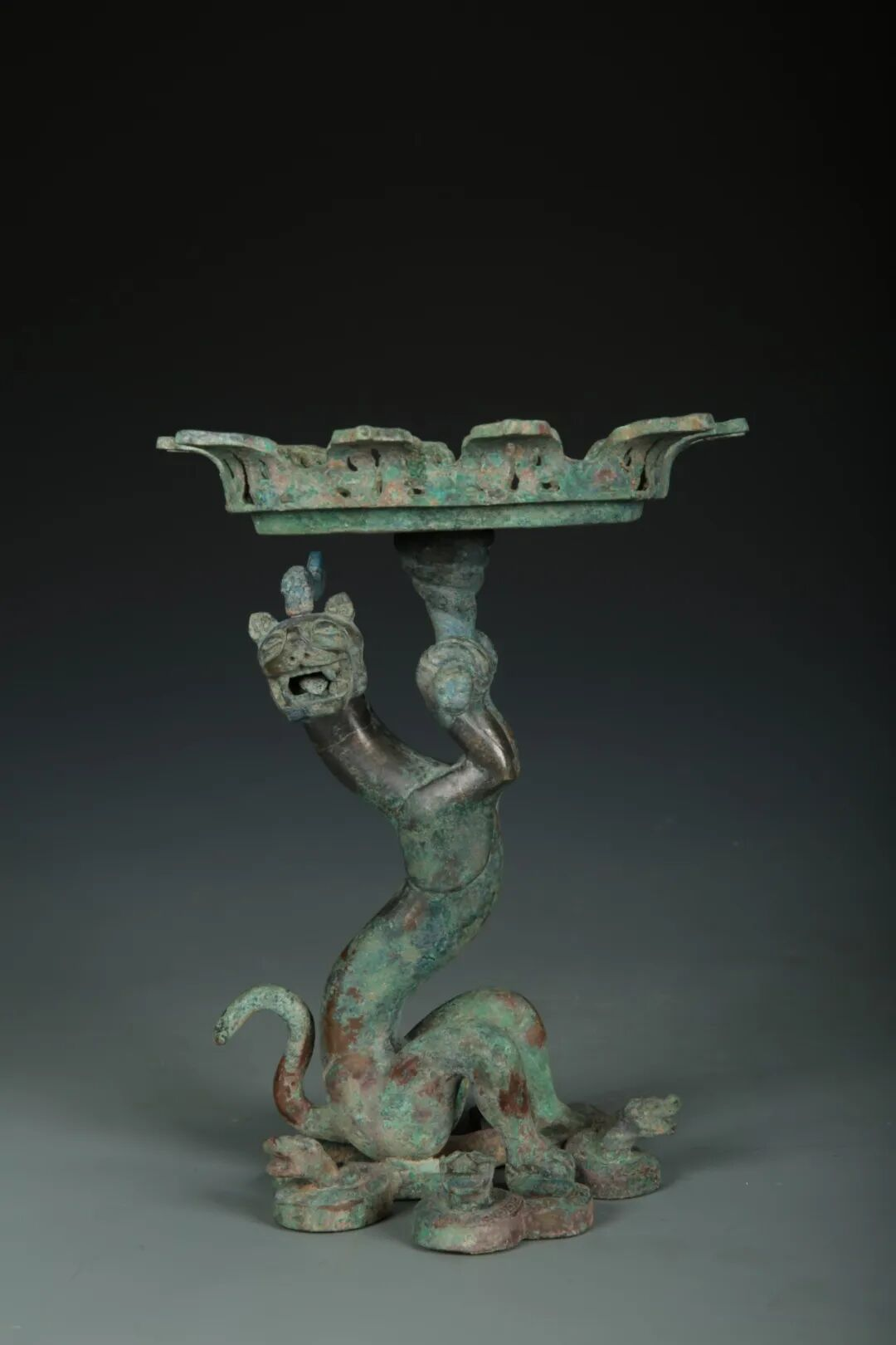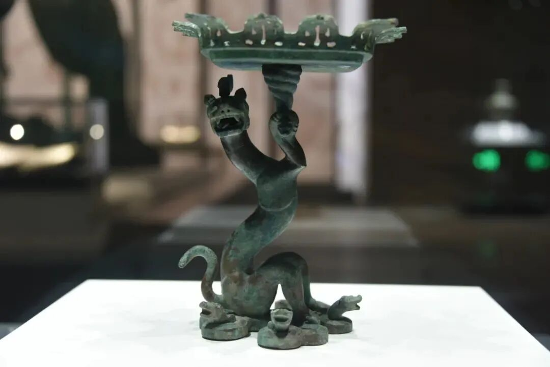 一只威风凛凛又带点萌态的小兽用前爪托起豆盘,它的后足之下,还踩着五条盘绕的蛇,蛇身饰云雷纹。整体造型复杂而稳固,展现了齐国工匠高超的青铜铸造技术。