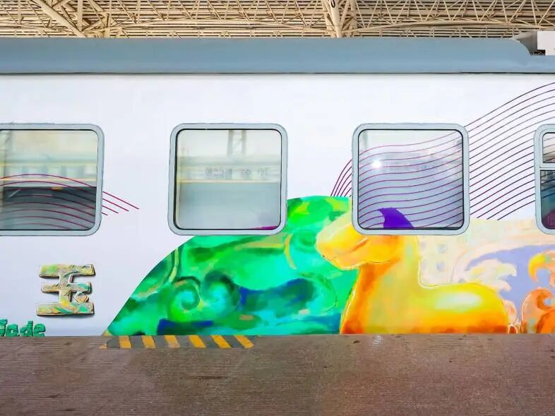 硬卧车厢的主题为玉。步入车厢,淡淡的青蓝色调如玉石般温润。手绘的黄玉马、玉鱼鹰、“宜子孙”玉璧……每一件都诉说着东方美学的含蓄与典雅。
