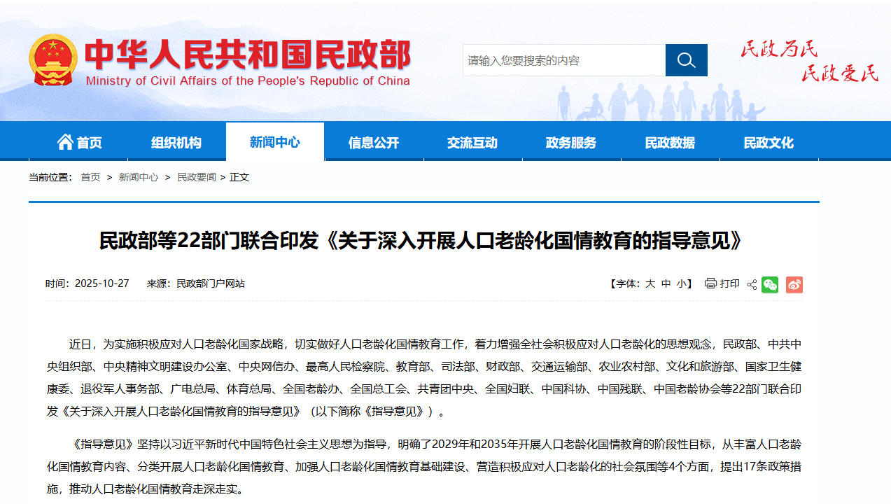 民政部等22部门联合印发《关于深入开展人口老龄化国情教育的指导意见》