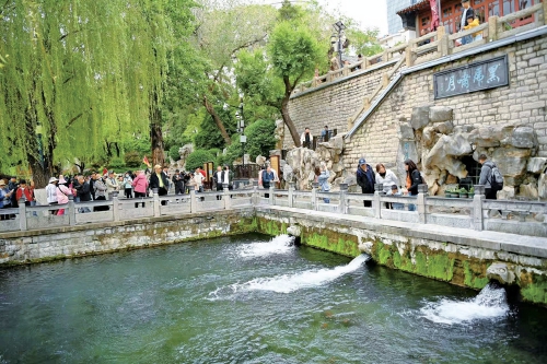 4月21日,济南护城河畔黑虎泉虎啸声声,吸引了众多游人驻足赏泉,观赏“黑虎啸月”胜景。由于上周末的一场降雨,给予泉城地下水很好的补充,当日趵突泉水位达29.09米,黑虎泉水位达29.27米,两大名泉较前一日均上涨4厘米,为近期最大上涨水位,泉池内水花翻涌的景象也愈发壮观。