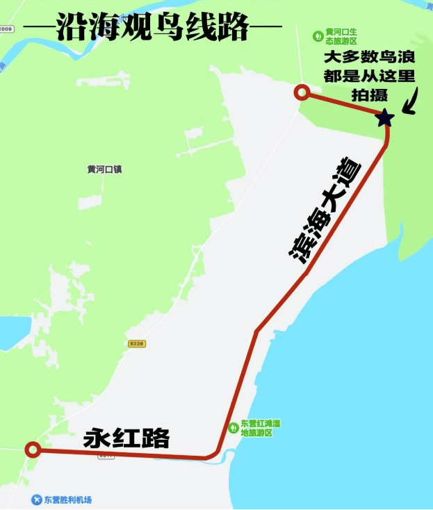 该线路自永红路与东八路交叉口向东,经过机场东湿地,沿滨海大道北上,途经小岛河码头、滨海湿地、黄河大坝,最终抵达黄河口知青小镇。