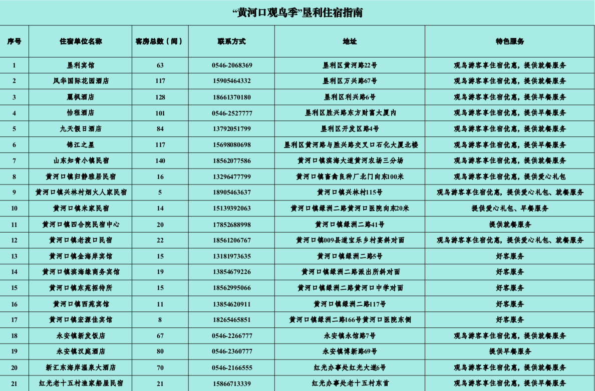我们整合了垦利城区及观鸟点附近21家酒店、民宿,分别在观鸟季期间推出观鸟主题优惠房,从经济型到舒适型全覆盖,满足您不同的住宿需求。