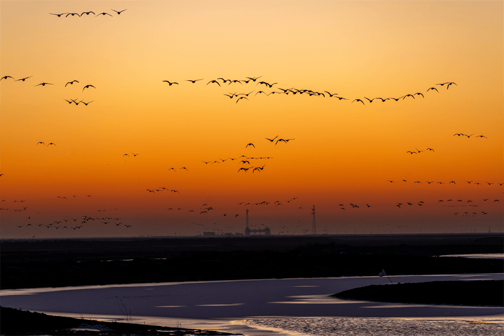 沿滨海大道北上,追一场落日鸟浪,看夕阳为候鸟镀上金边,数万只鸟儿盘旋成流动的“鲲鹏”奇观,正如《庄子·逍遥游》中所讲,“鲲之大,不知其几千里也,化而为鸟,其名为鹏”!
