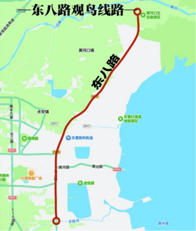 该线路南起支脉河,沿东八路北上,途经机场湿地、稻田画风景区、张镇河中桥、湿地观景平台,最终抵达黄河口生态旅游区。