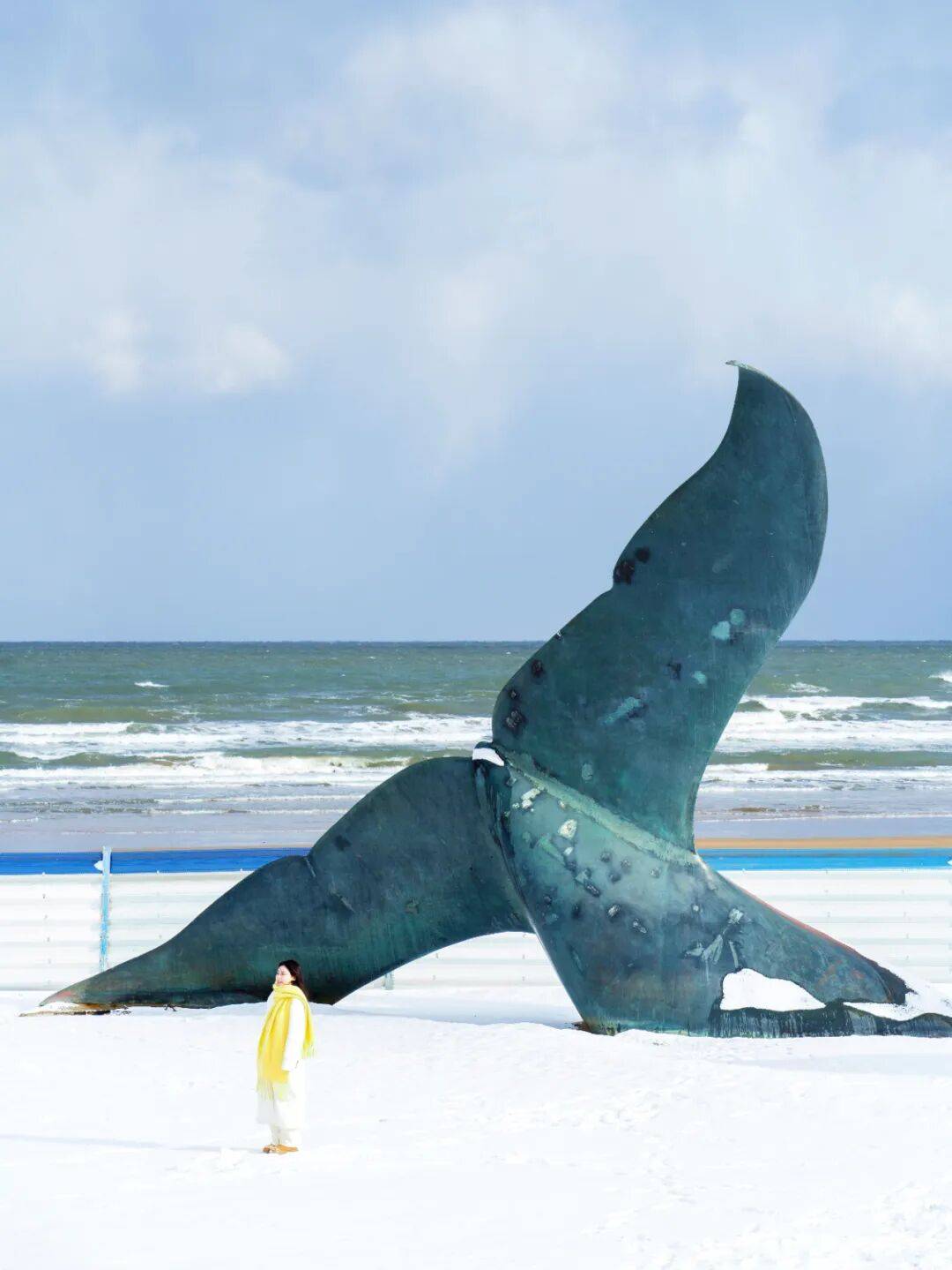 坐落在金沙滩上的一只大鲸鱼,是全网爆火的烟台网红机位。雪中巨鲸唯美浪漫,震撼感拉满!