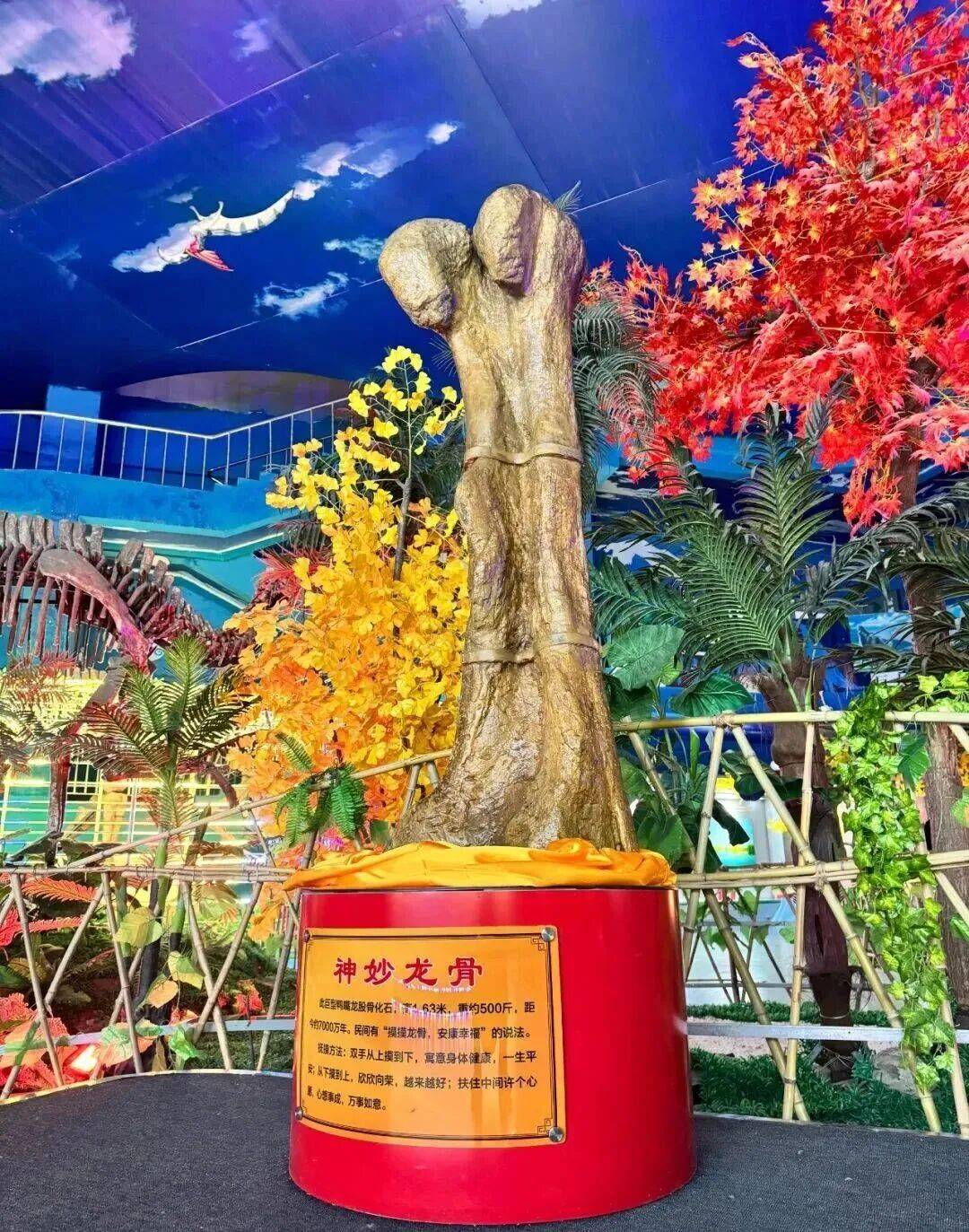镇馆之宝——巨大诸城龙,高 9.1米、长16.6米的鸭嘴龙化石,是吉尼斯世界纪录的保持者。还有重达500多斤的骨化石,被誉为“华夏第一奇骨”。