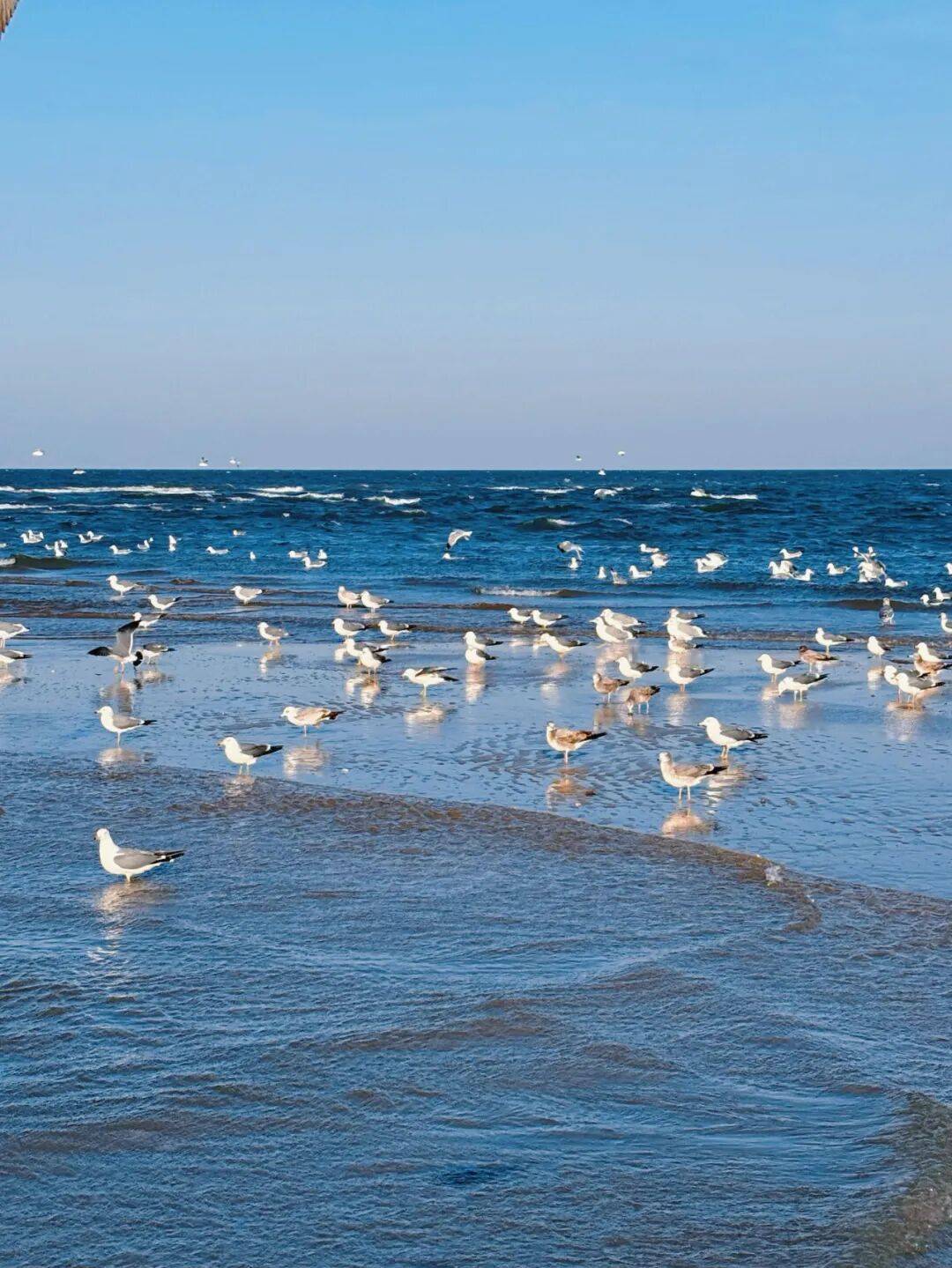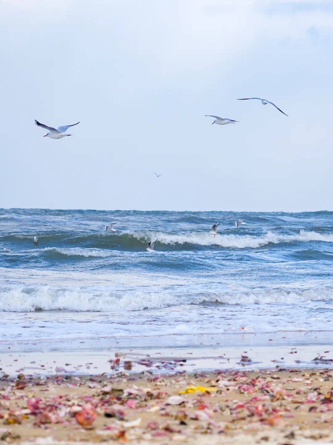 这片沙滩真的藏满了粉色贝壳!阳光下闪闪的,像散落的星星。冬天这里也是海鸥的聚集地,成群飞舞,超级治愈~