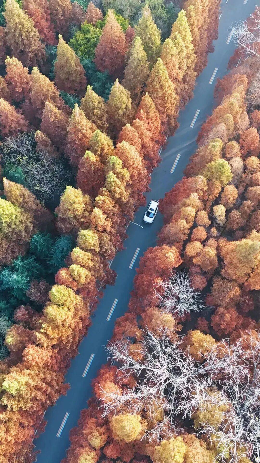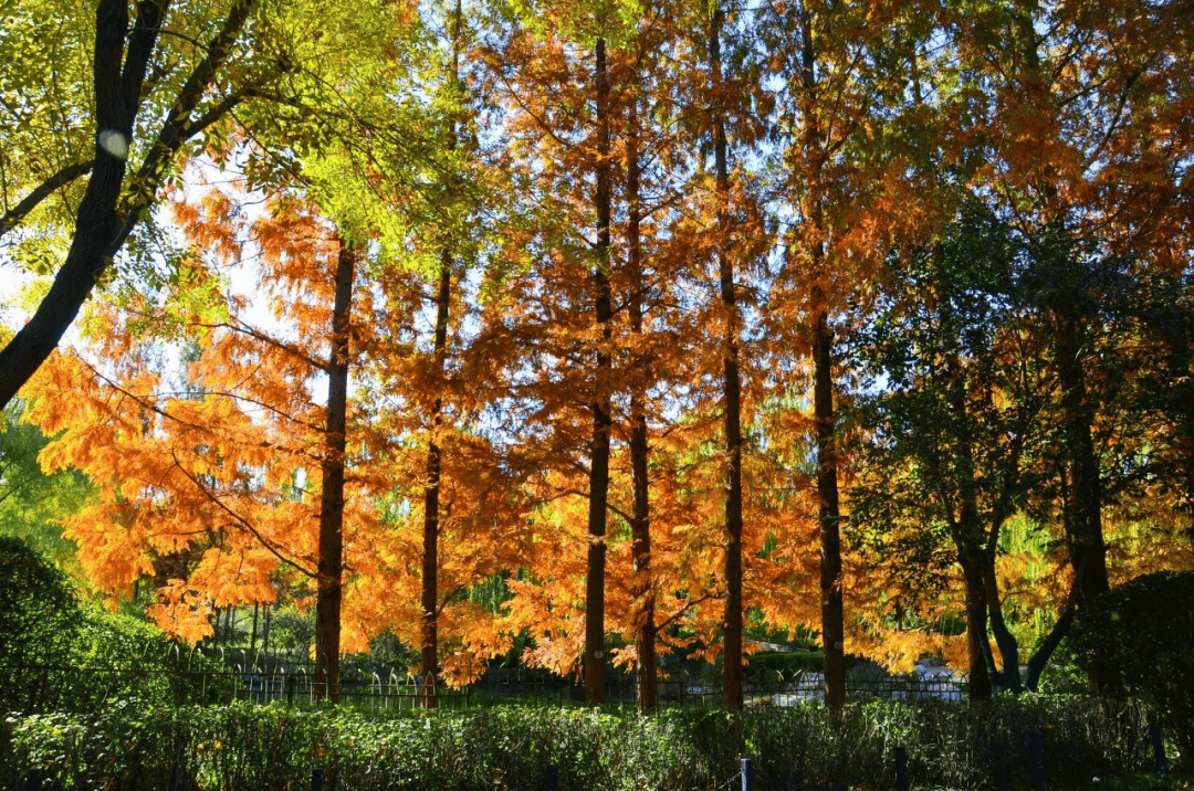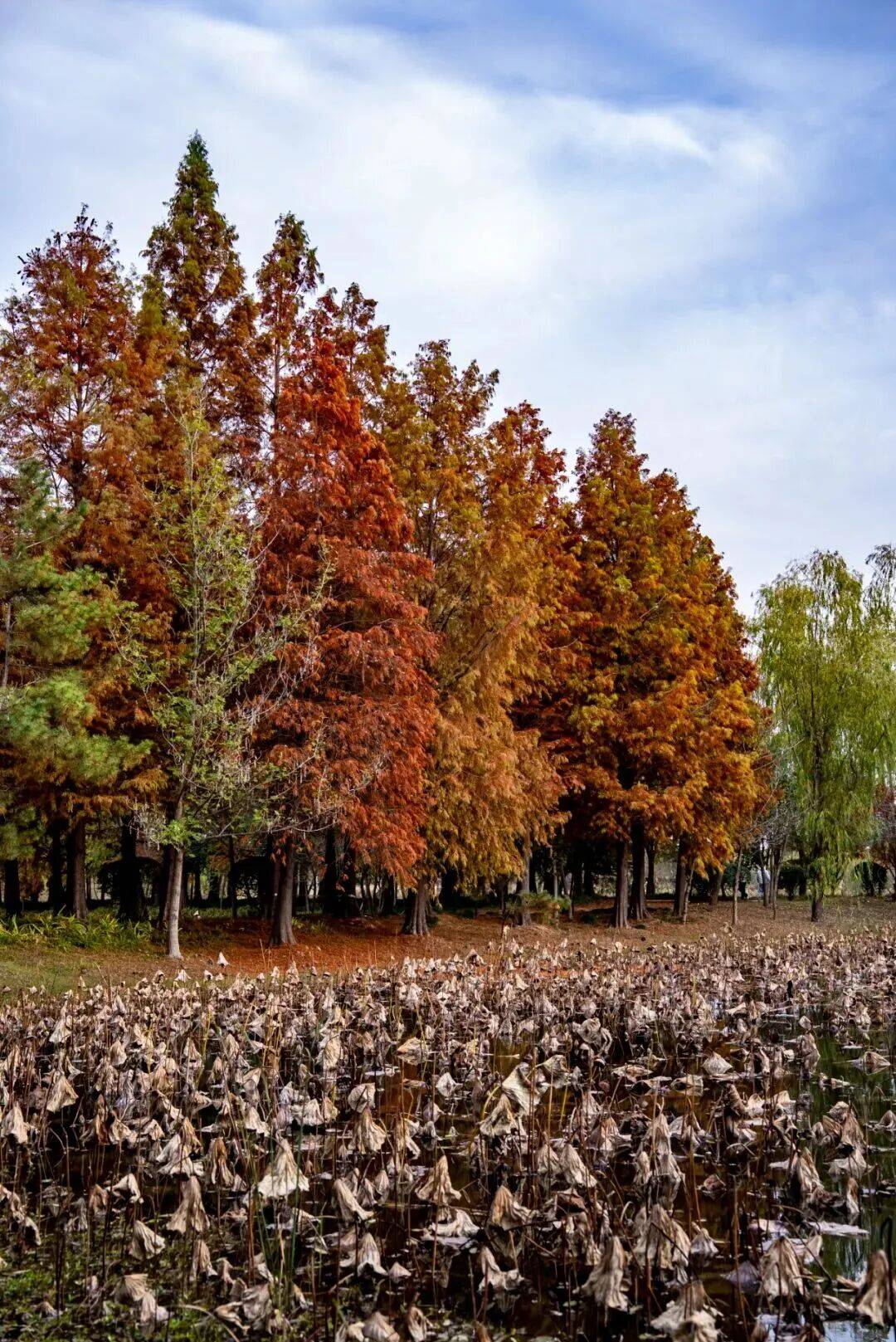 高大的水杉树,像是被大自然打翻了调色盘,枝叶从深秋的红棕,已然过渡到初冬的金红,绚烂无比。