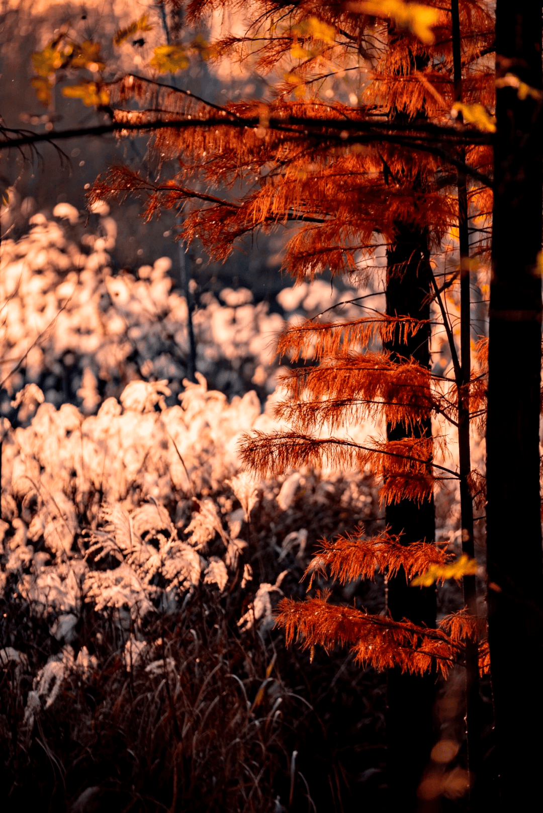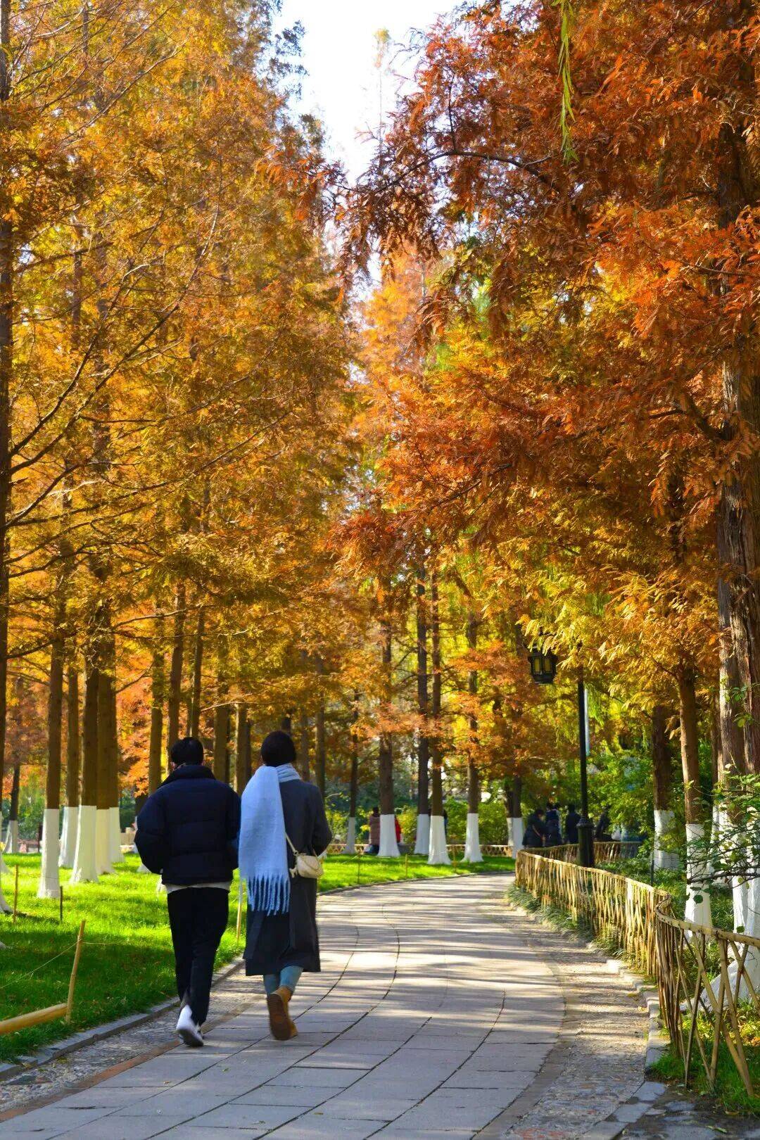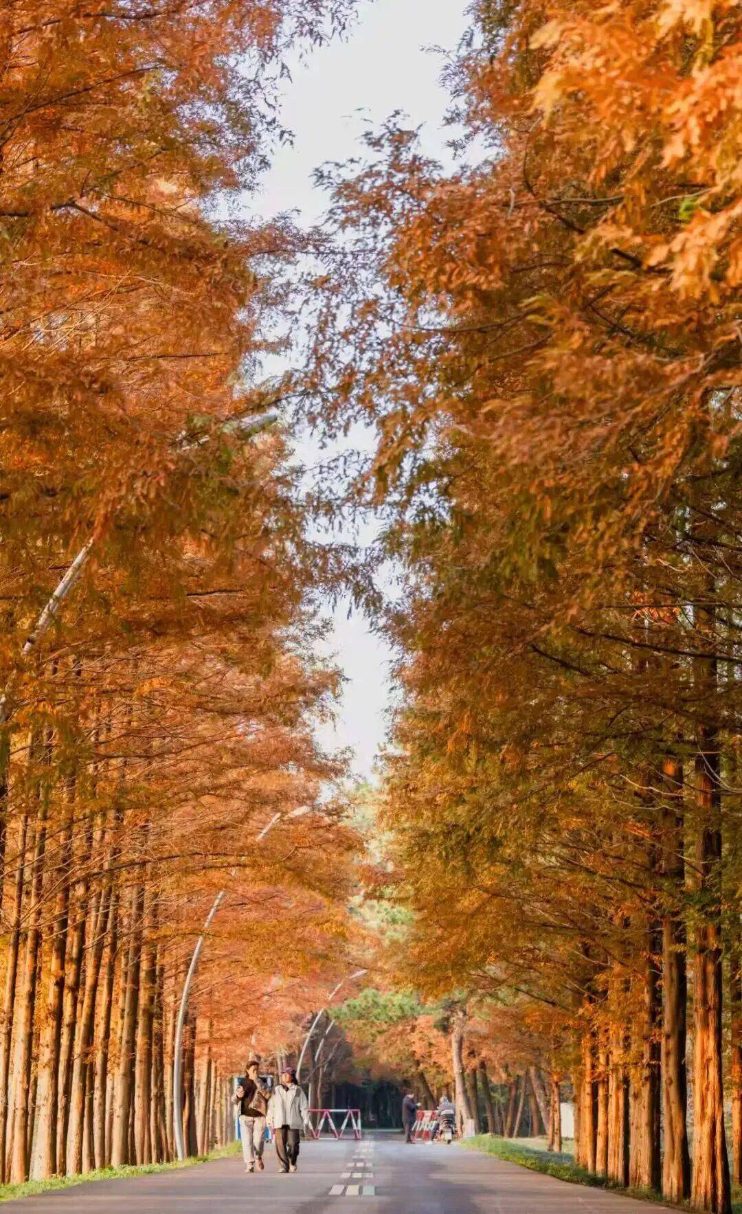 高大的水杉树,像是被大自然打翻了调色盘,枝叶从深秋的红棕,已然过渡到初冬的金红,绚烂无比。