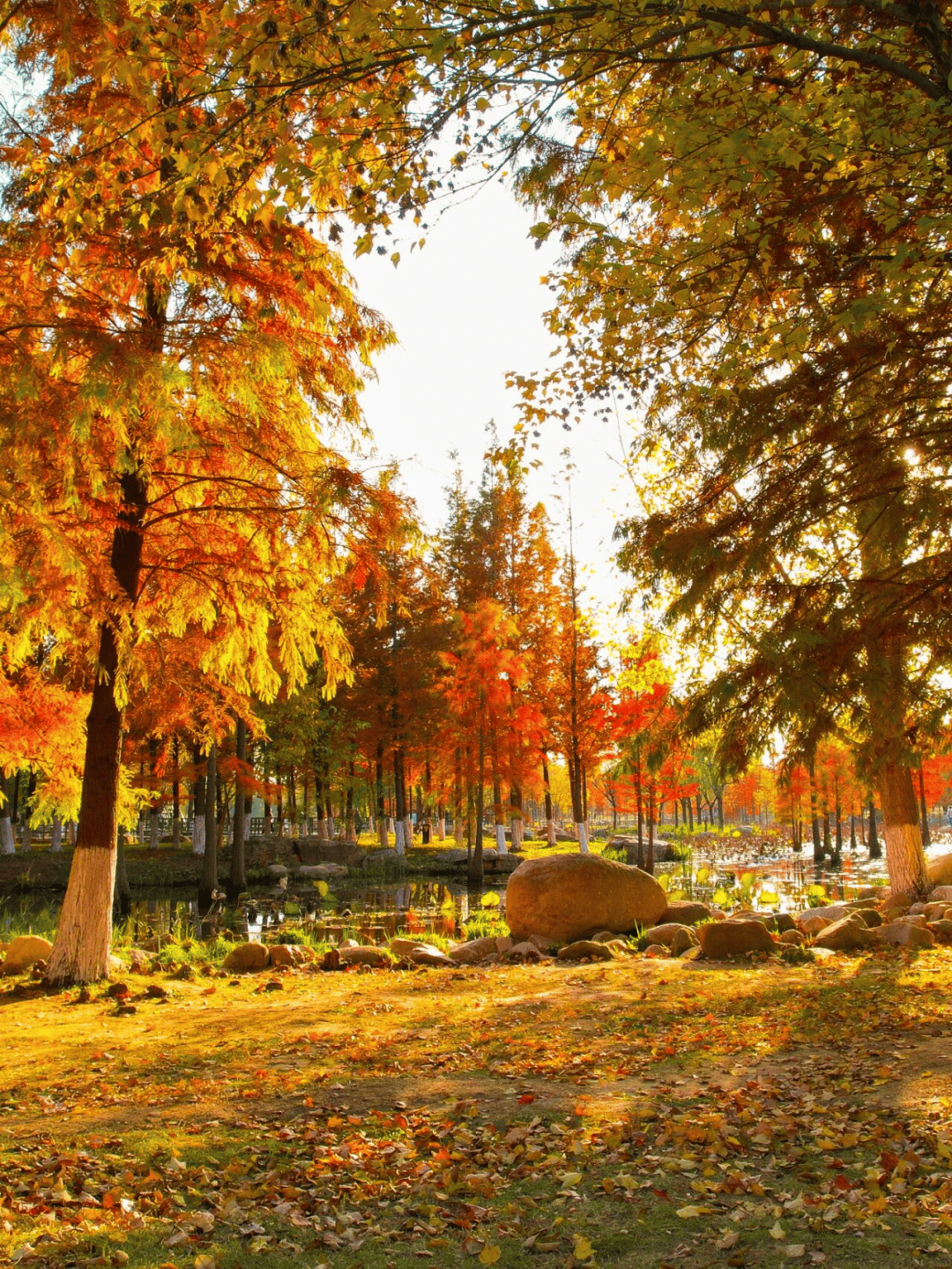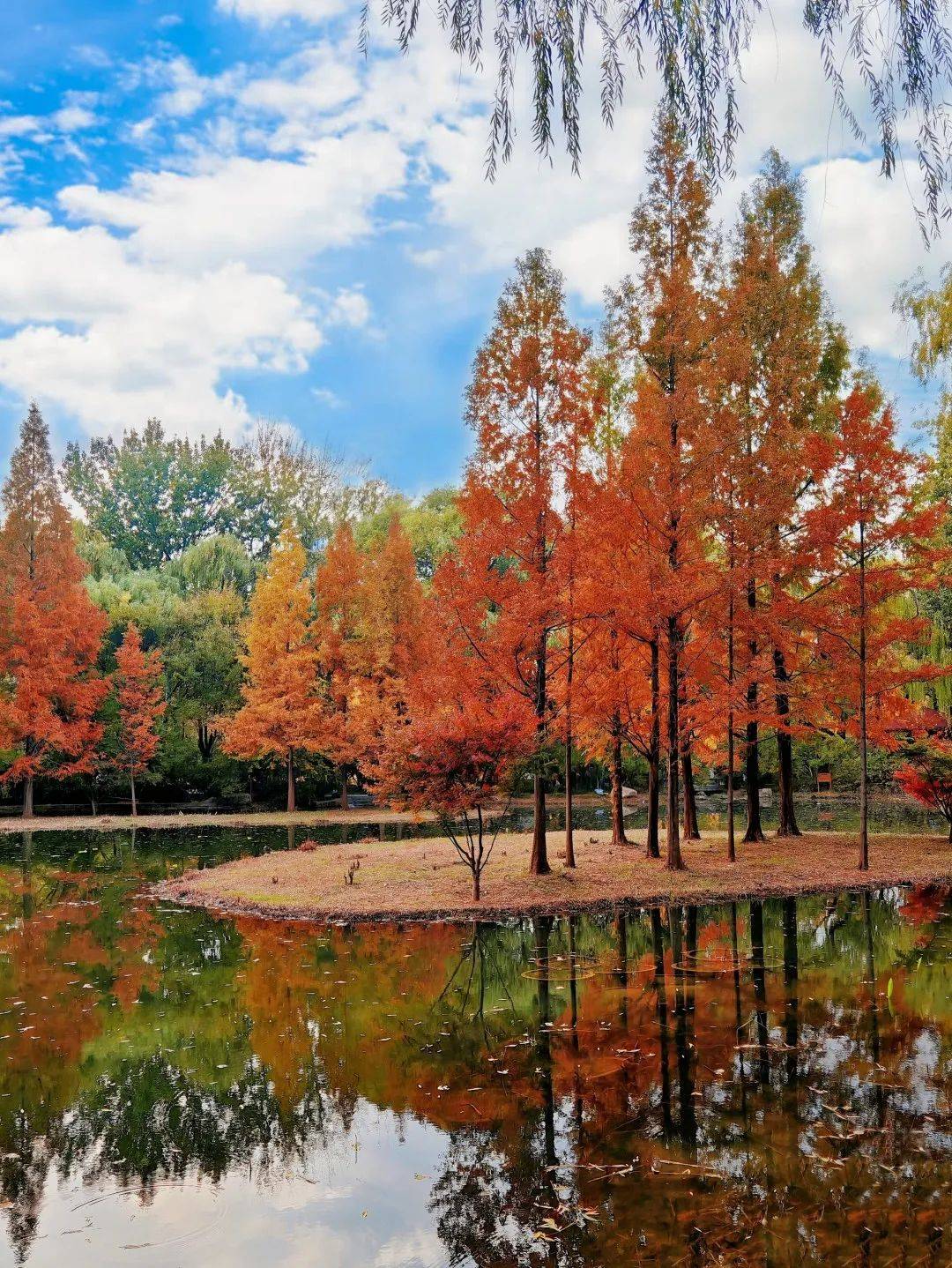 中山公园里孙文莲池旁,弥漫着醉人的水杉红,氤氲水汽弥漫,杉林绚烂红火,历经曦光,倒影成画,从晨至昏,美得如同幻境。