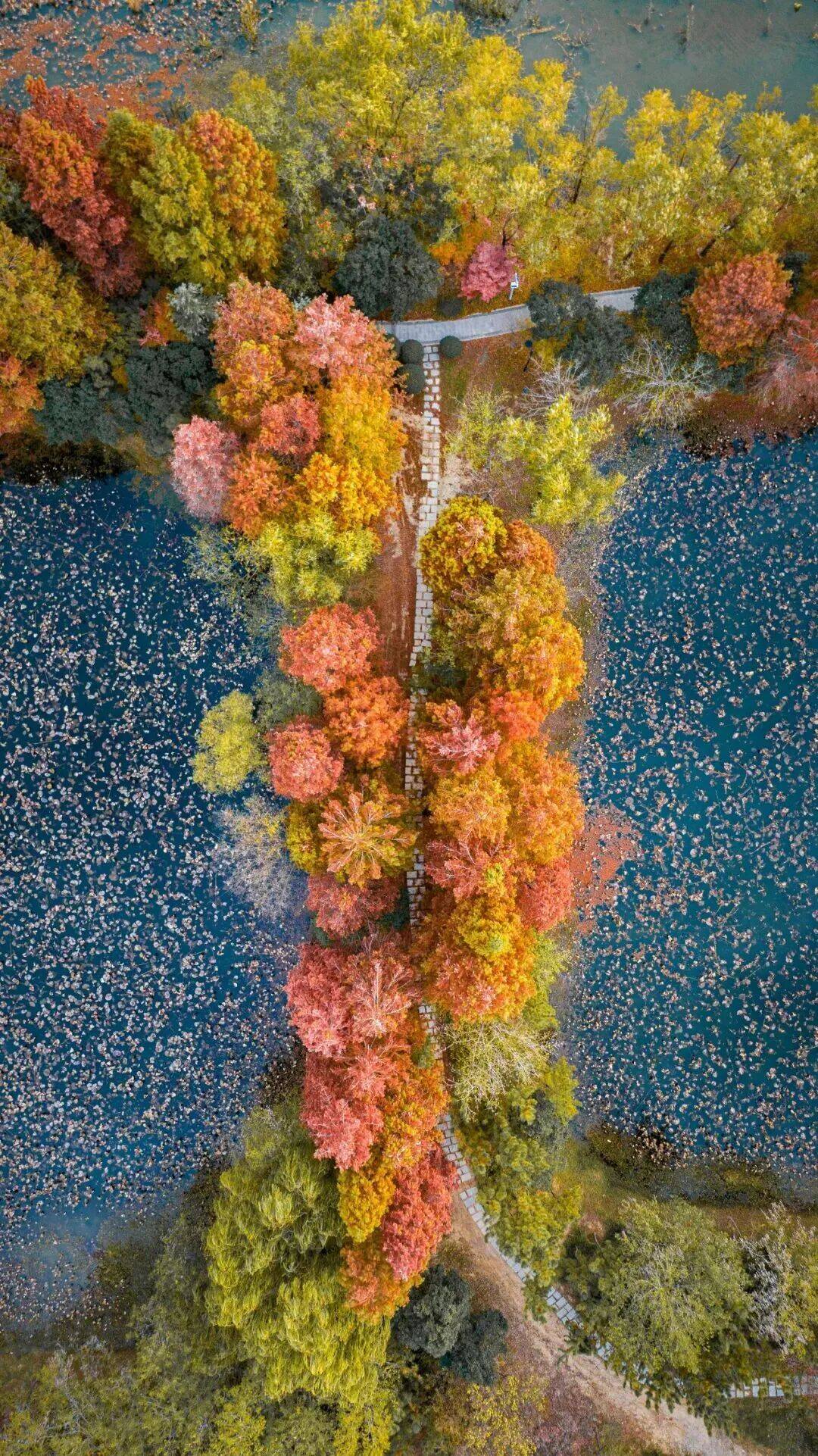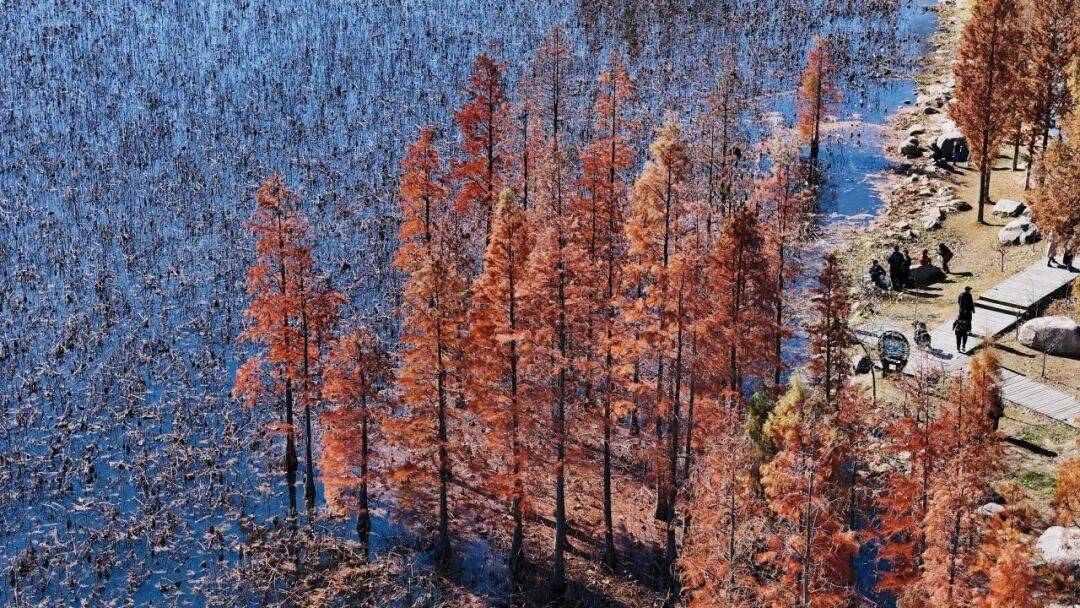 冬日暖阳倾洒,层林尽染的水杉赤红似火,倒影入湖,宛如烟花般令人沉醉。