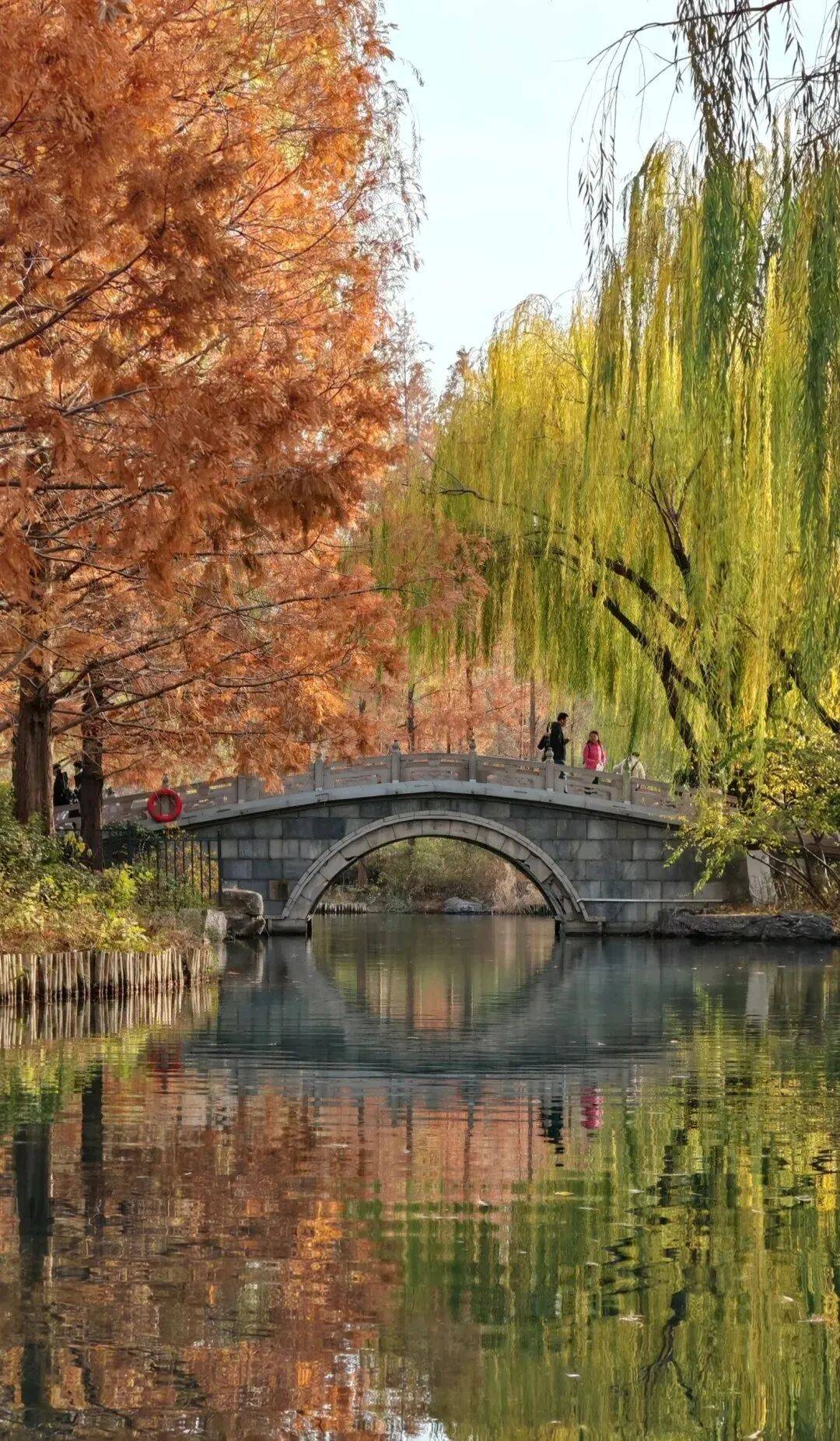 红杉与黄柳隔水相映,浓烈的色彩映入澄澈湖中,悄然化去了冬日的萧瑟,为济南添上一笔温暖而明艳的色调。