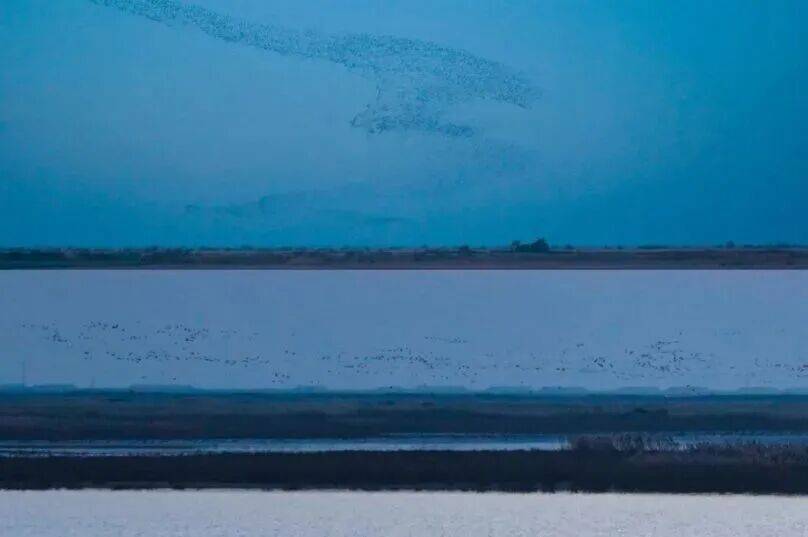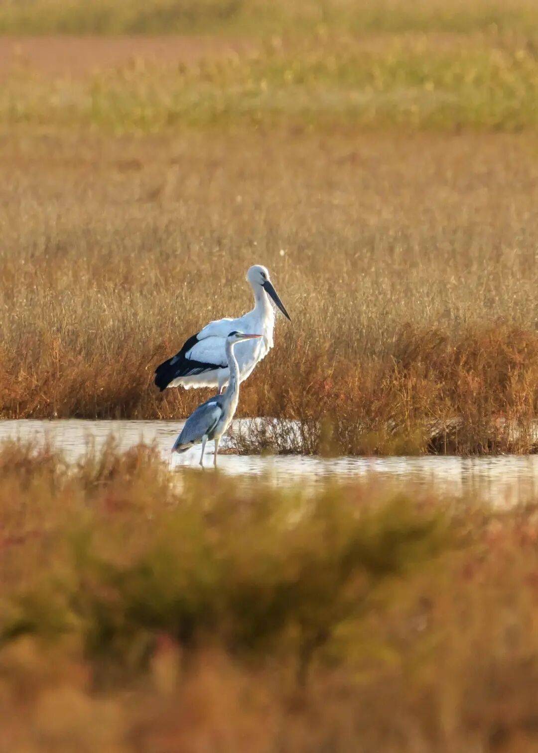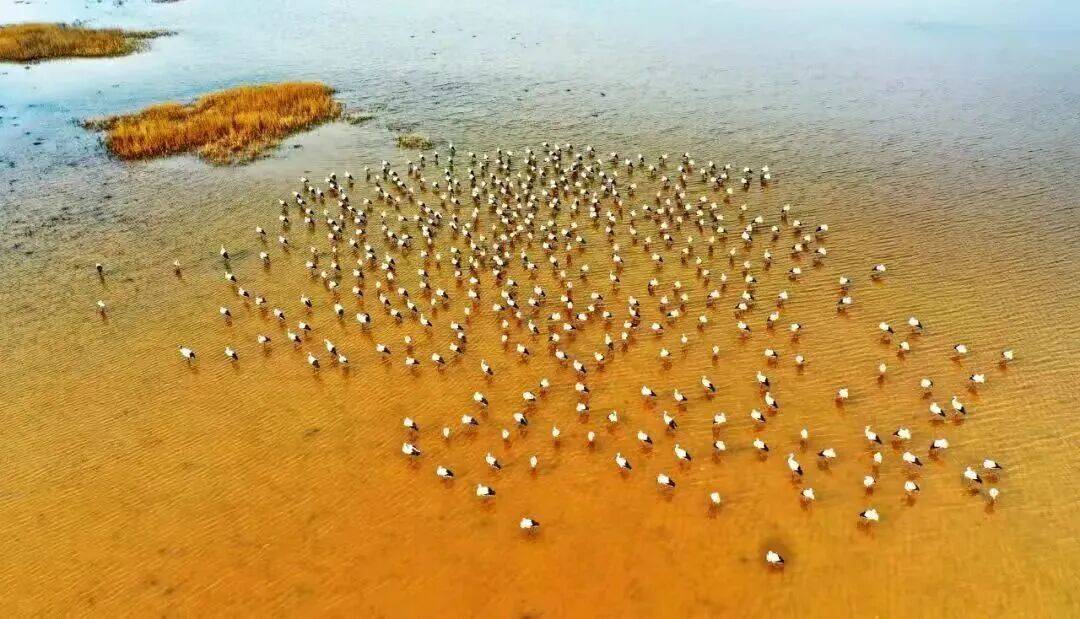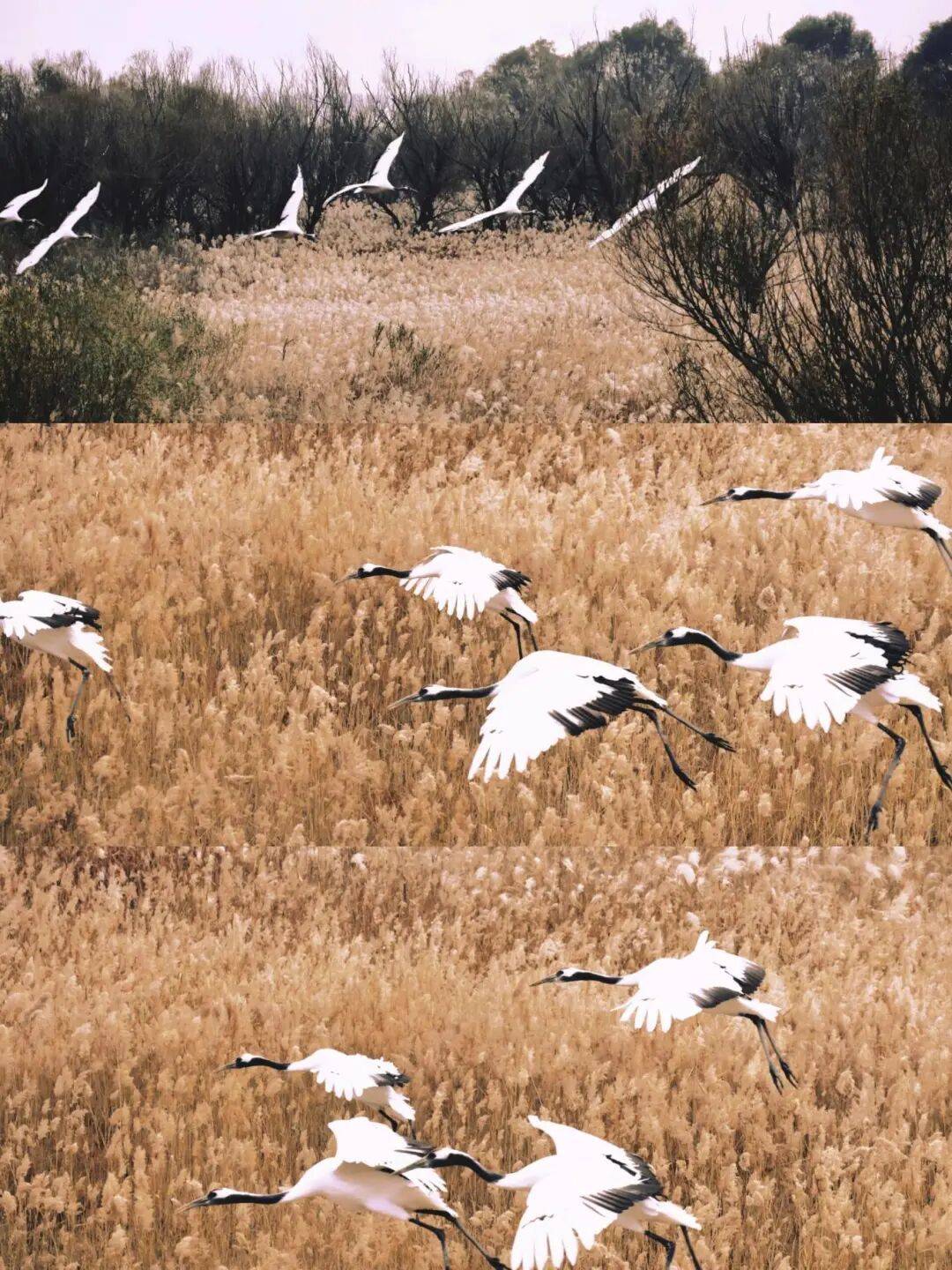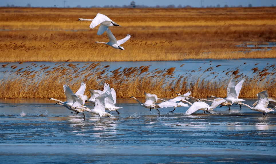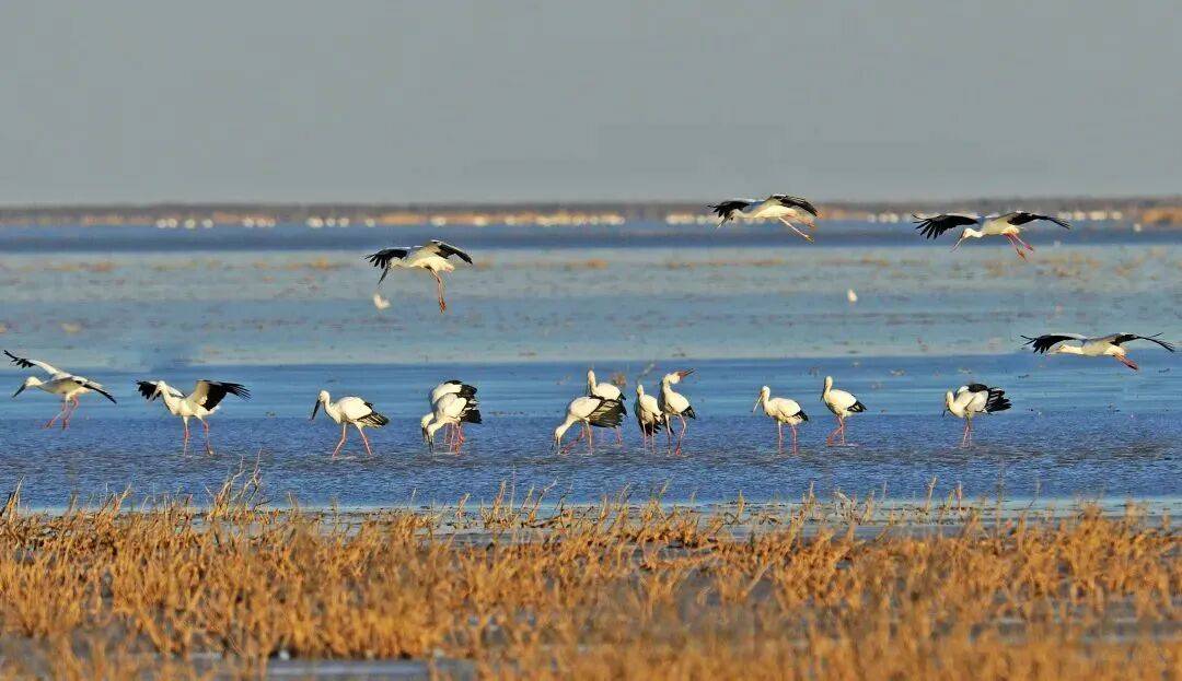 每年11月至次年3月,白鹤、丹顶鹤、东方白鹳等200余种、数百万只候鸟在此集结,或在芦苇荡中栖息觅食,或在滩涂上翩跹起舞。