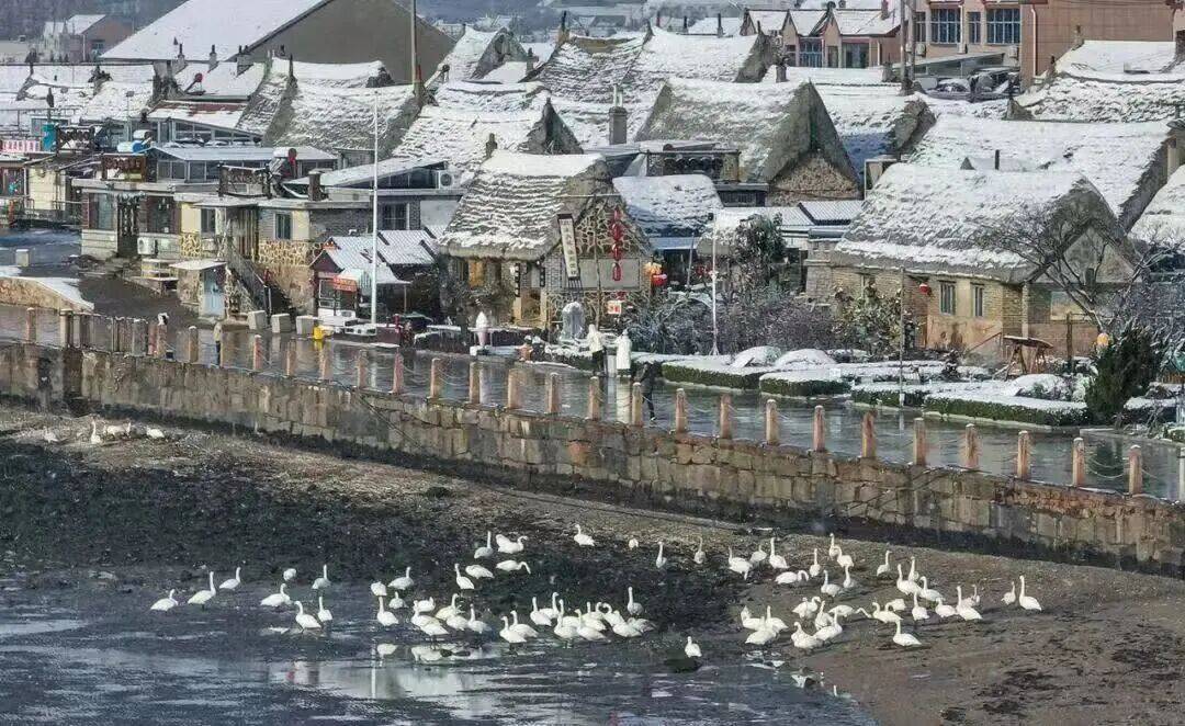 烟墩角村是一个古朴的海草房渔村。每年冬季,大天鹅都如约而至。它们在村前的海湾中游弋,脖颈弯曲的弧度优雅如诗。