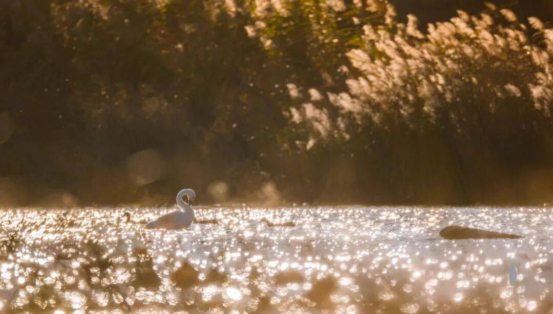 每当橙红的晨光悄然浸染天际,它们洁白的羽翼便被镀上一层金晕,如诗如幻。有的在平静的湖面悠游滑翔,划出银色的水痕;有的在浅岸舒展长颈,从容觅食。那份恬静与诗意,连莫奈笔下的光影世界也仿佛稍逊几分生动。
