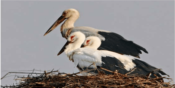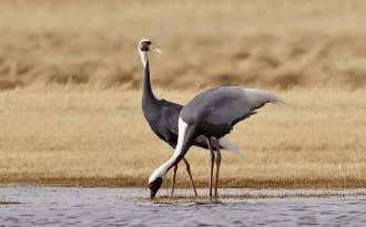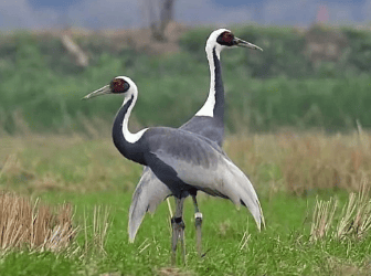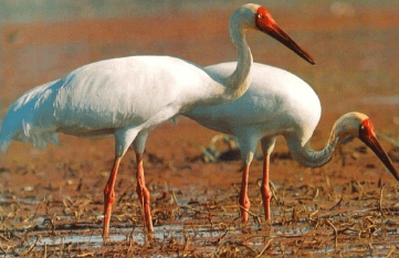 白枕鹤:国家一级保护动物,体长120-150厘米,全身羽毛灰色,额和两颊皮肤裸露呈艳红色,头顶及颈背部为白色。