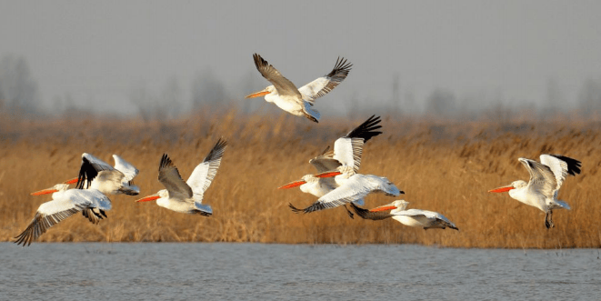 卷羽鹈鹕:国家一级保护动物、世界珍稀濒危物种,也是全球最大的淡水鸟类之一,体长约160-180厘米,体重达11-15公斤。它们通体暗灰色,颈部羽毛呈卷曲状,拥有巨大的铅灰色长喙和标志性的喉囊。最佳观鸟地在滨海大道沿线湿地、黄河口生态旅游区等。