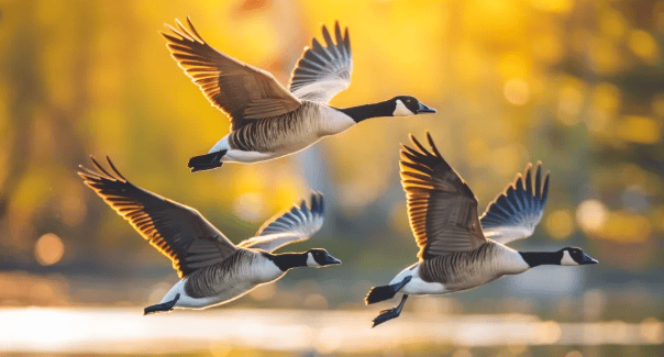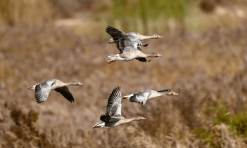 鸿雁:体长约80-94厘米,是家鹅的祖先。通体灰褐色,头顶至后颈暗棕褐色,嘴黑色(前端具黄色斑块),脚橙黄色,飞行时可见白色臀斑,常与灰雁混群。